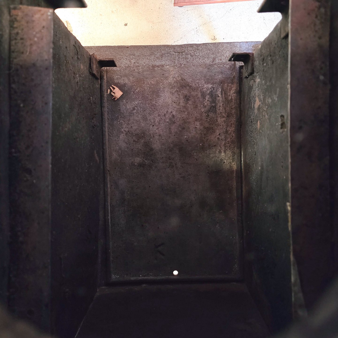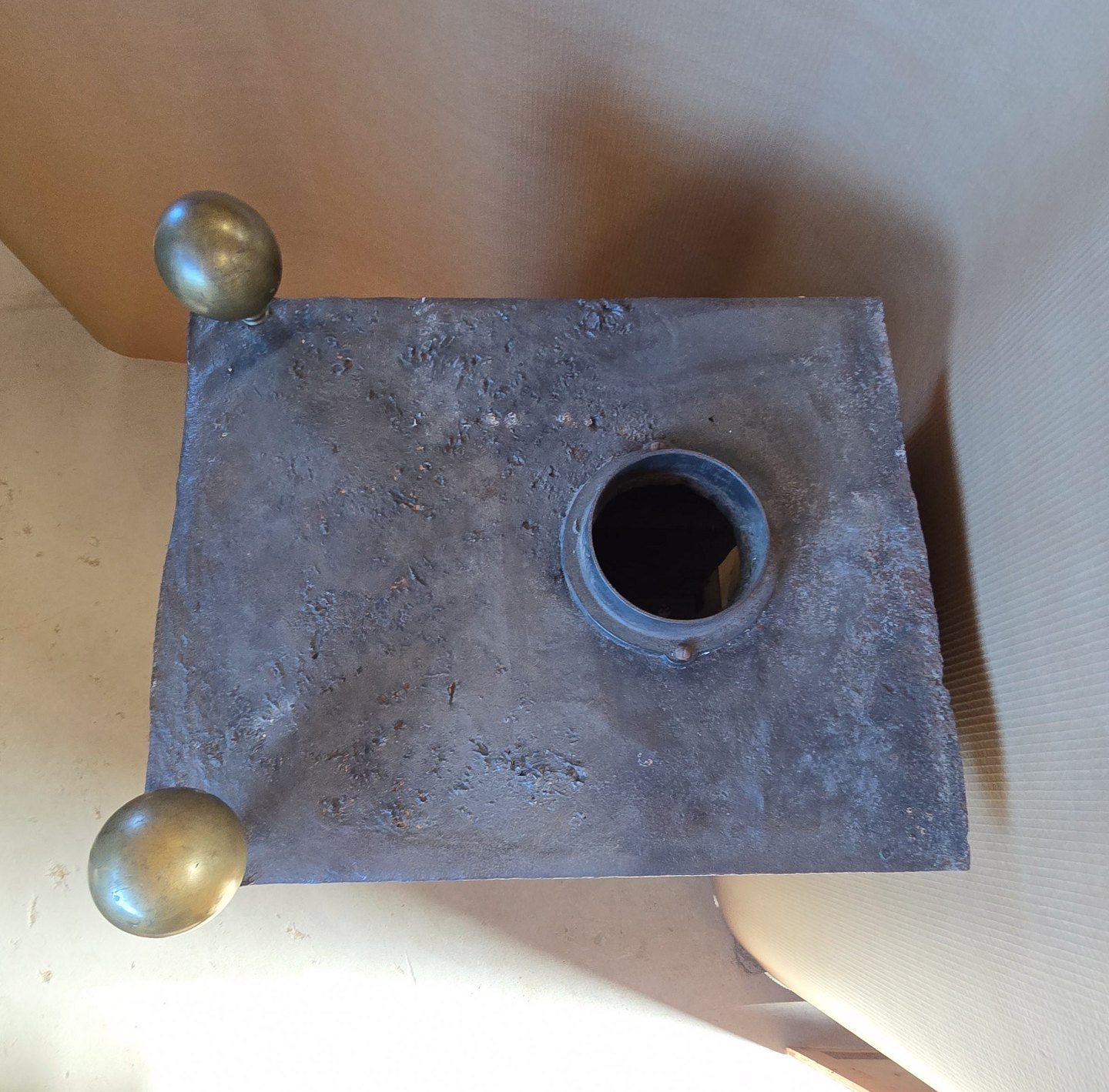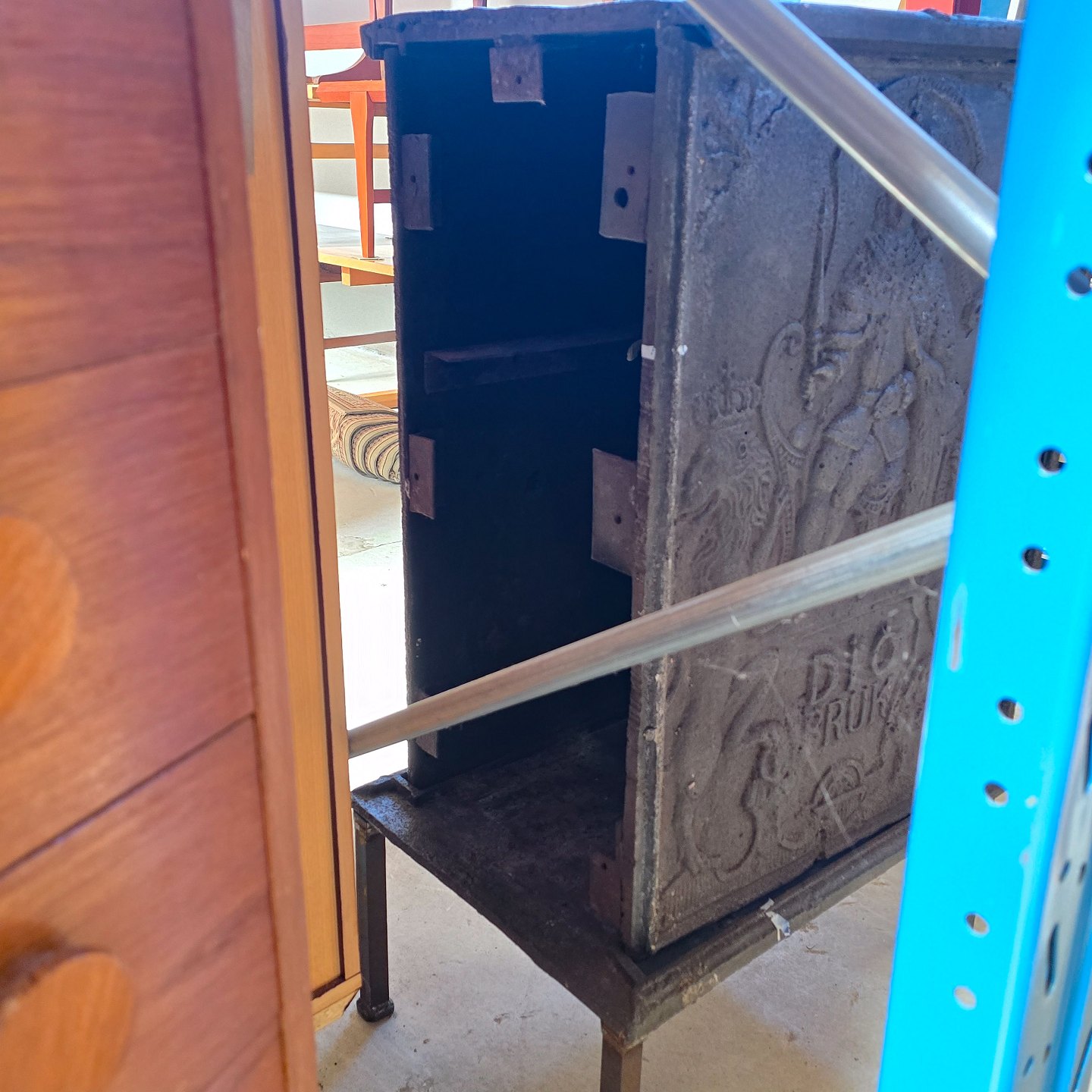 Antik svensk bilæggerovn i støbejern fremstillet i perioden år 1750-1800. Ovnen er dekoreret med motiv af den svenske konge siddende på tronen omgivet af to løver samt den svenske konge til hest. Ovnen har monteret to kugler i messing på toppladen.