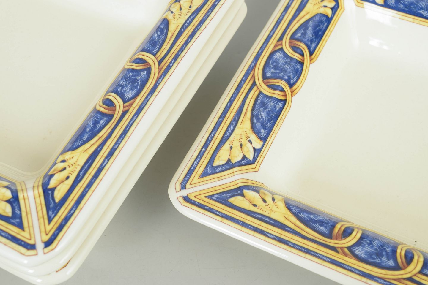 Dekorativt sæt i keramik bestående af fire middagstallerkner med bred kant dekoreret i blå, gule og gyldne toner med ornamentale mønstre.