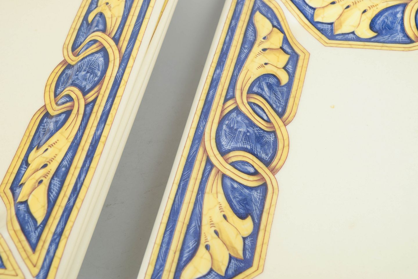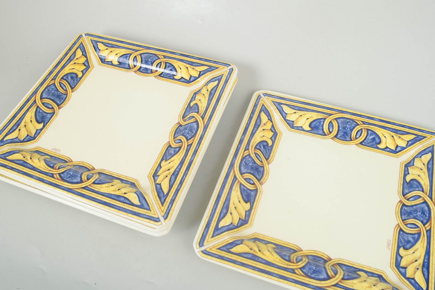 Decorative ceramic set consisting of four dinner plates with a wide border in blue, yellow and gilt tones with ornamental motifs.