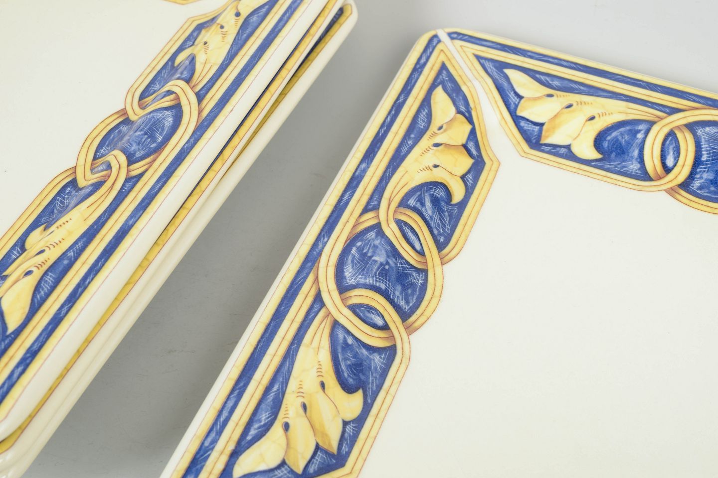 Dekorativt sæt i keramik bestående af fire middagstallerkner med bred kant dekoreret i blå, gule og gyldne toner med ornamentale mønstre.