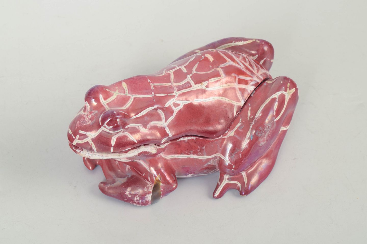 Naturalistisk formet frø udført i glaseret keramik med låg, dekoreret i dyb rosa glasur med lyse krakeleringer. Model fremstår som en dekorativ og funktionel opbevaringsgenstand fra Kählers kunstneriske produktion i slutningen af 1800-tallet.