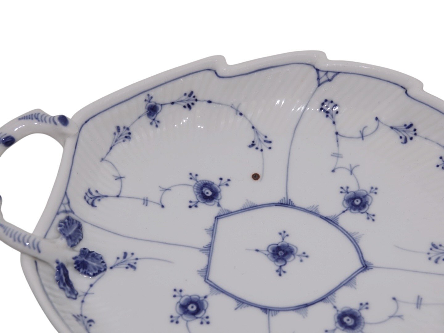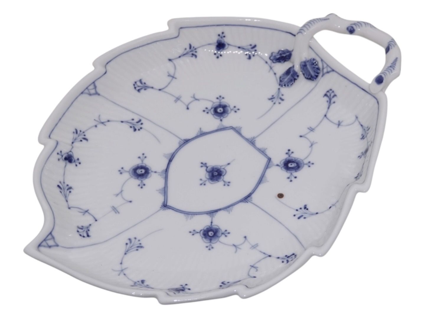 Royal Copenhagen Musselmalet Riflet, stort kagefad med sjældent set blade i relief.
