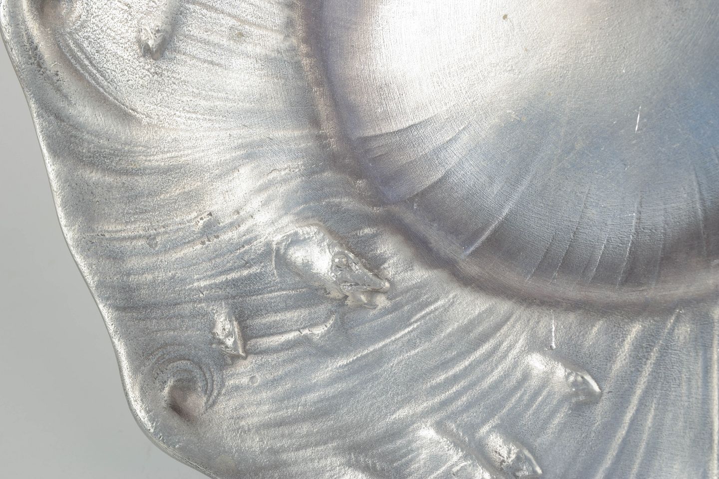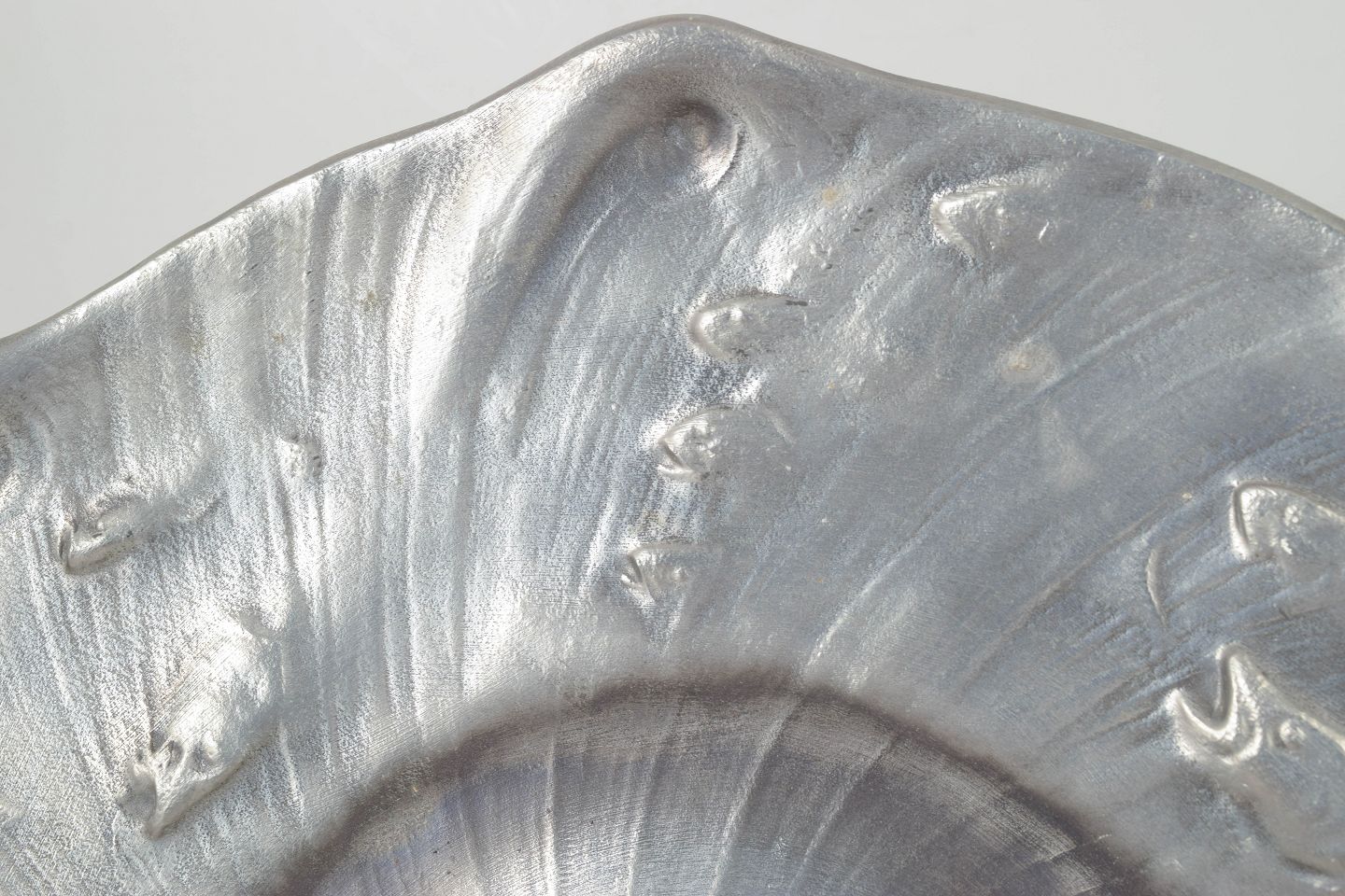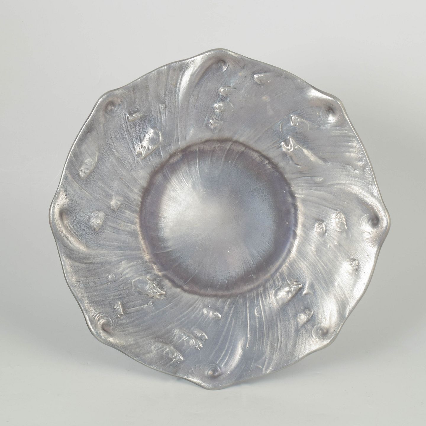 Stort dekorativt fad i tin med organisk bølgende form og fiske reliefdekoration, produceret for Schreuder & Olsson, Stockholm.