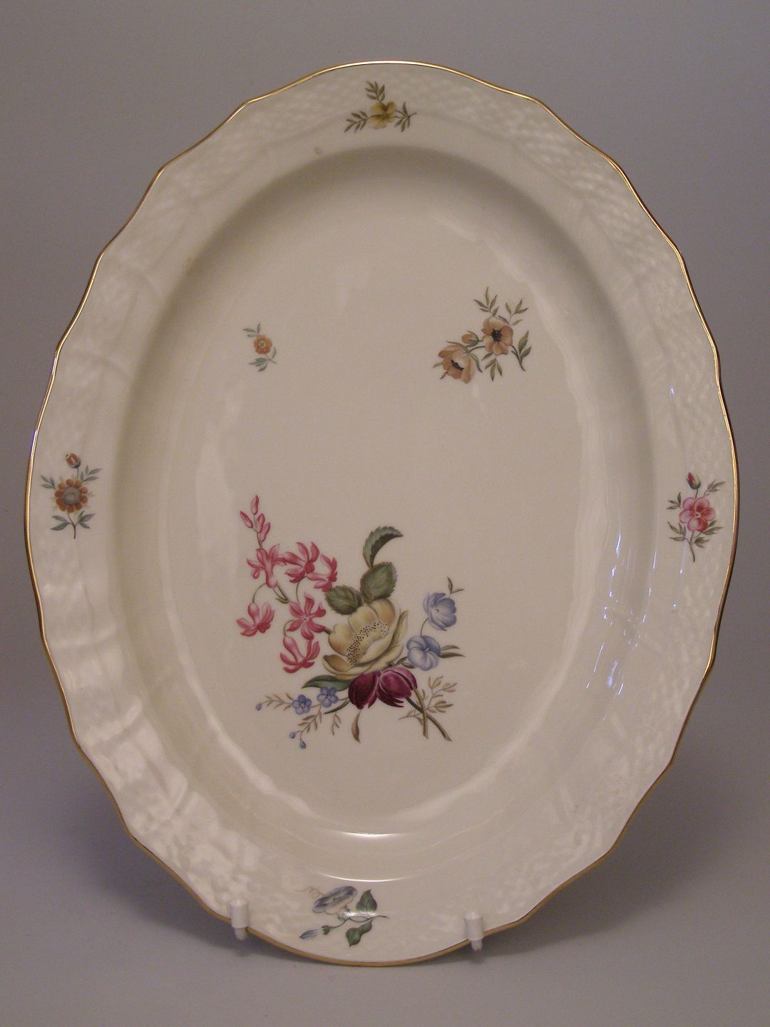 Royal Copenhagen,1556-910 Ovalfad l:36 b:26,5 , Frijsenborg Blomstermotiv på svejfet stel med guldkant