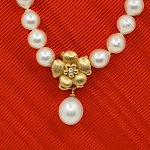 Pearl necklace with a 14k gold clasp, set with emerald and diamonds