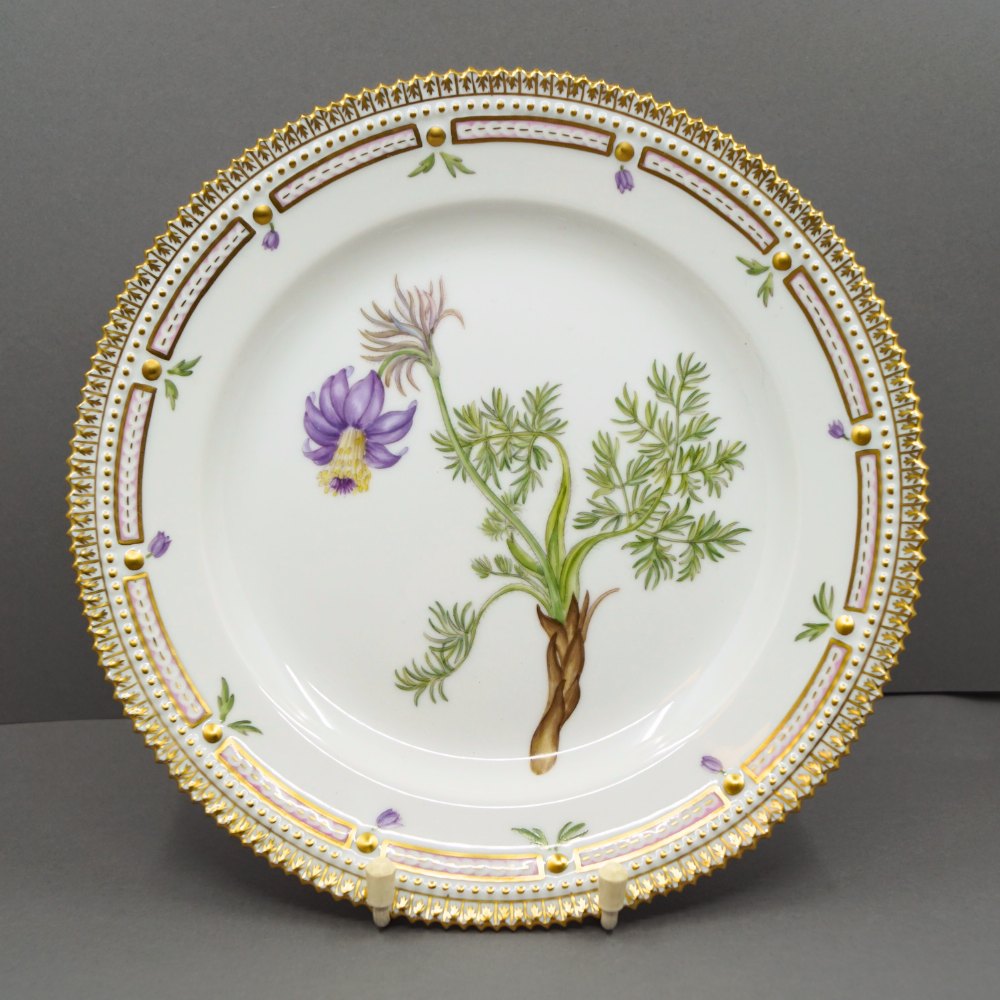 Royal Copenhagen, Flora Danica porcelain; Lunch plate #3550. Decoration: Anemone pratensis L. Decorated in colours and gold with flowers.