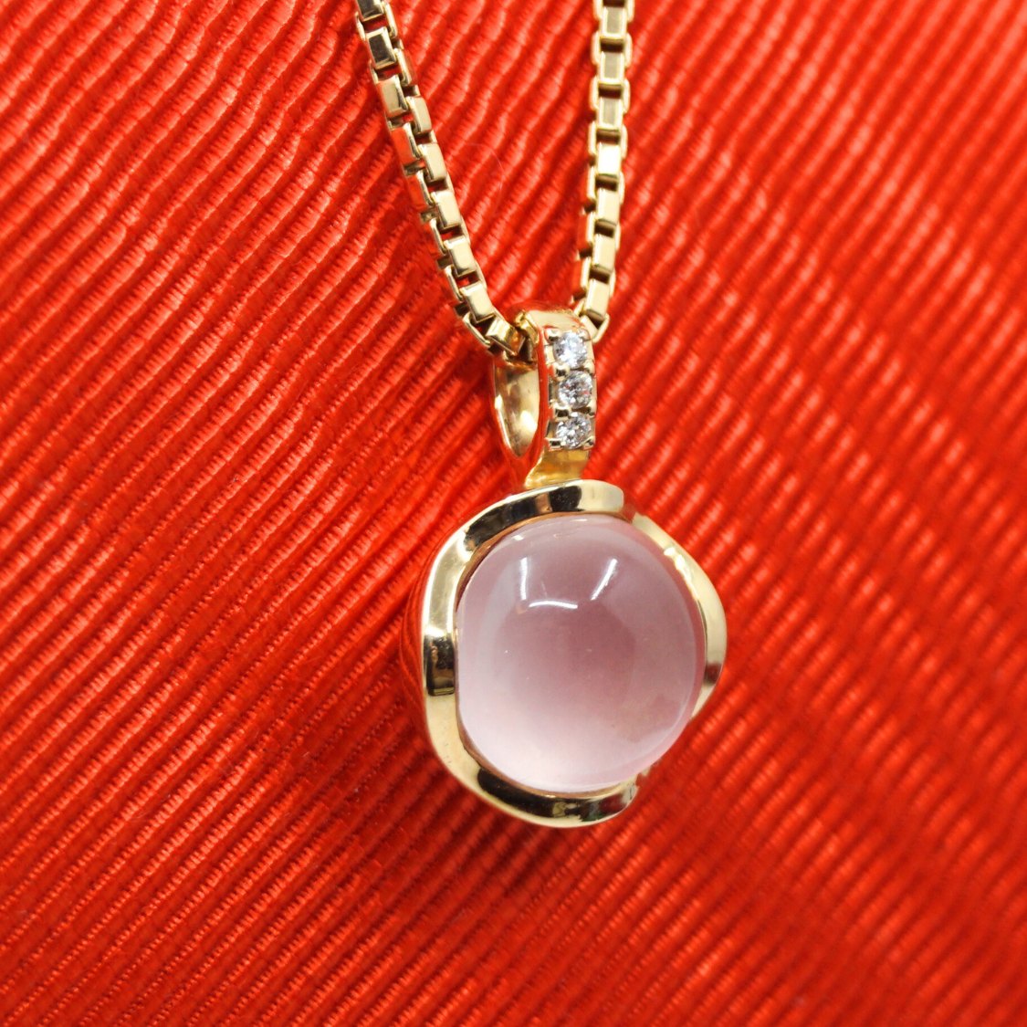 A pendant in 14k gold set with a rose quartz and three small diamonds.