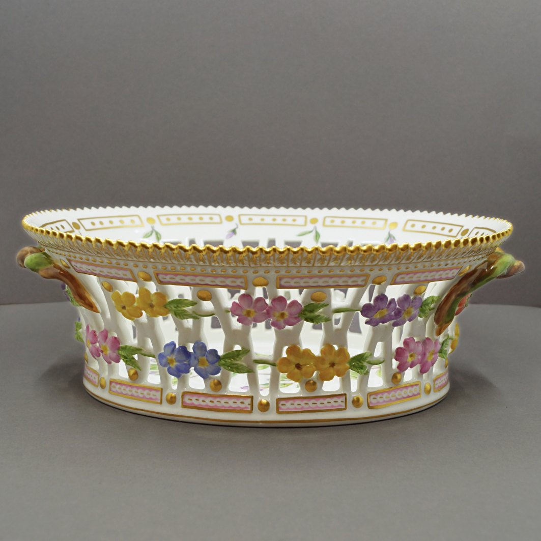 Royal Copenhagen, Flora Danica porcelain; An oval fruit bowl #3536 with pierced border. Decoration: Gentiana eampestris L. Decorated in colours and gold with flowers.