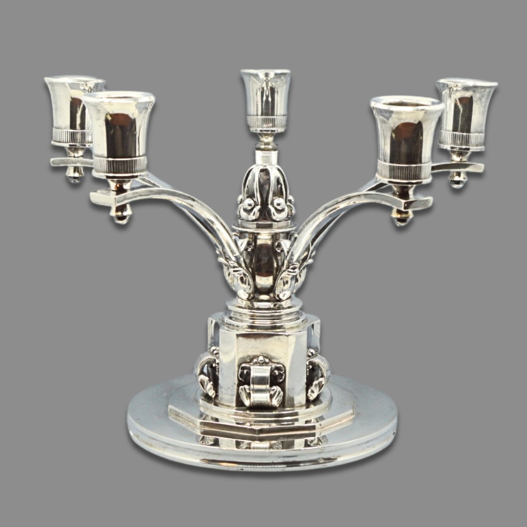 Evald Nielsen silver candlestick. Evald Nielsen; Five-armed candlestick in silver. H. 19 cm. Dia. top. 25 cm. Dia. bottom. 15 cm. Stamped with three towers and "Evald Nielsen". Evald Nielsen design silver.
