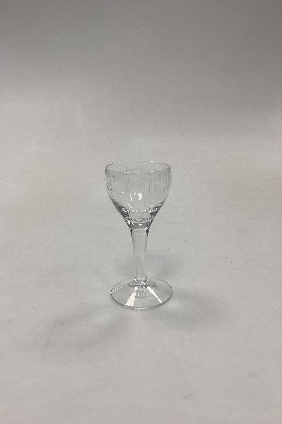 Kirsten Pil Schnapps Glass from Holmegaard. 8.5 cm H. The glass is ingraved with round shaped pierced by a straight line. Designed by Per Lütken in 1956.