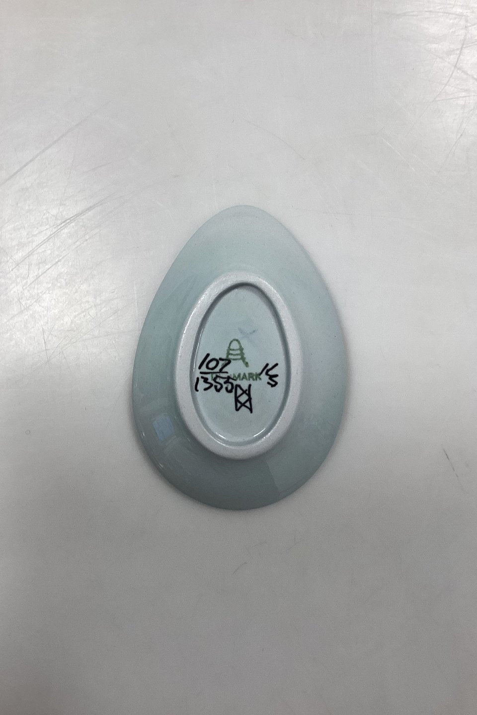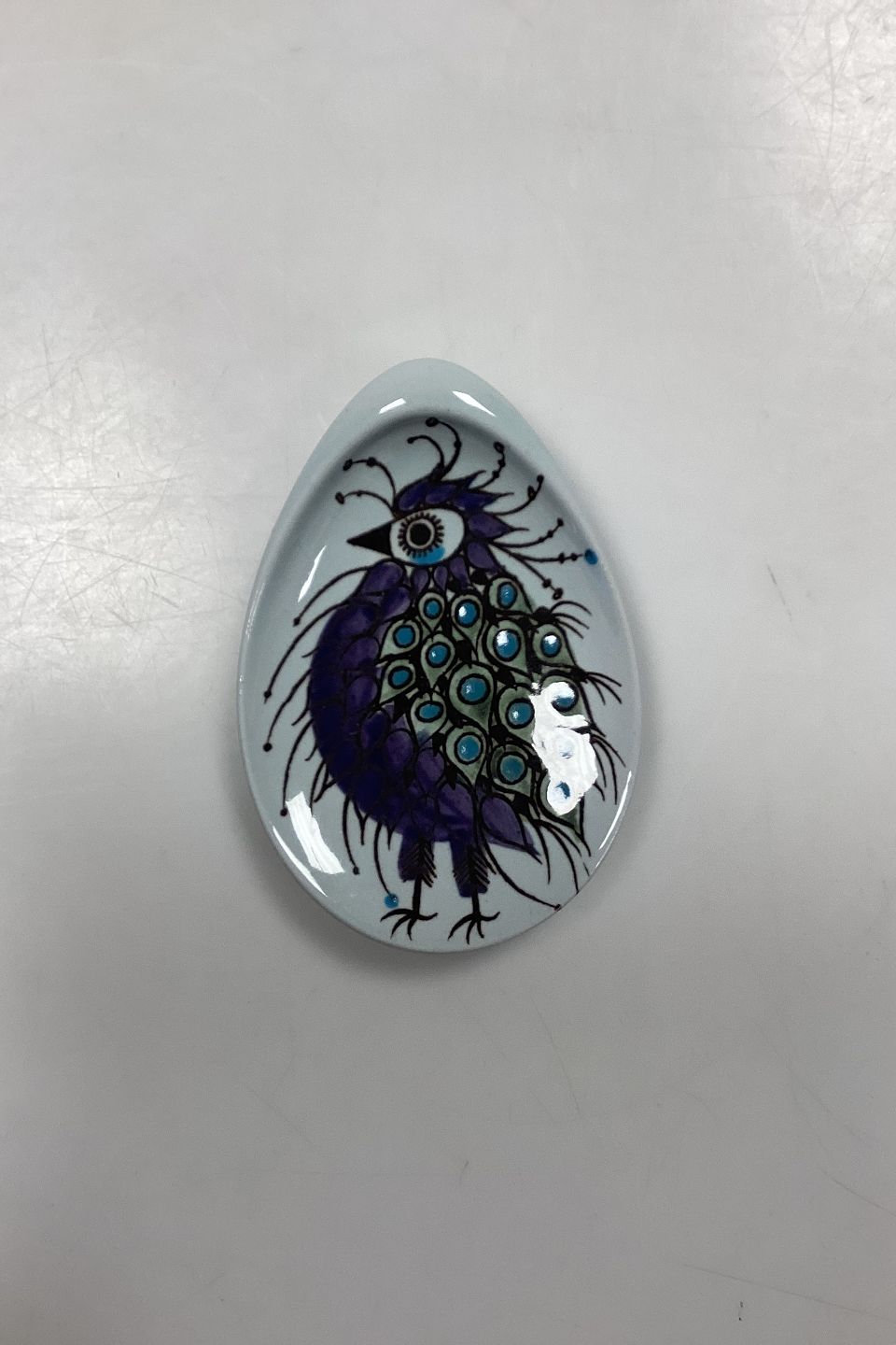 Aluminia Fajance Tenera Kuvertskål No. 107/1355. Motiv: Fugl i lilla og blå. Designet af Beth Breyen.