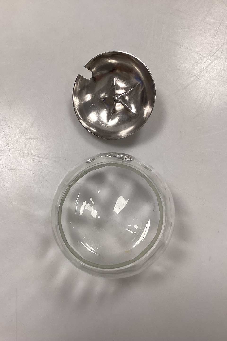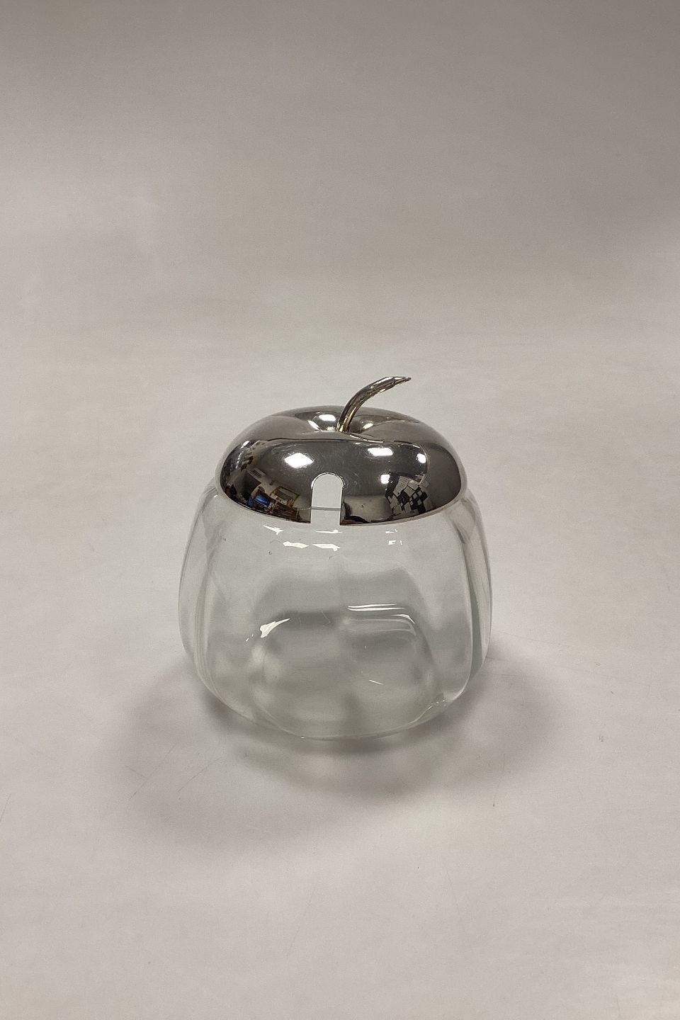 Engelsk Sølvplet/EPNS Marmeladekrukke. Glasset har optiske riller, og låget er formet som toppen af et æble.