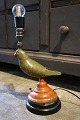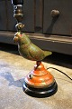 Dekorativ , gammel bordlampe i form af lille fugl i bemalet messing der holder lampeskærmen. Har sort træbund.