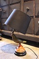 Lampen har en fin gammel patina og er monteret med sort stofskærm.