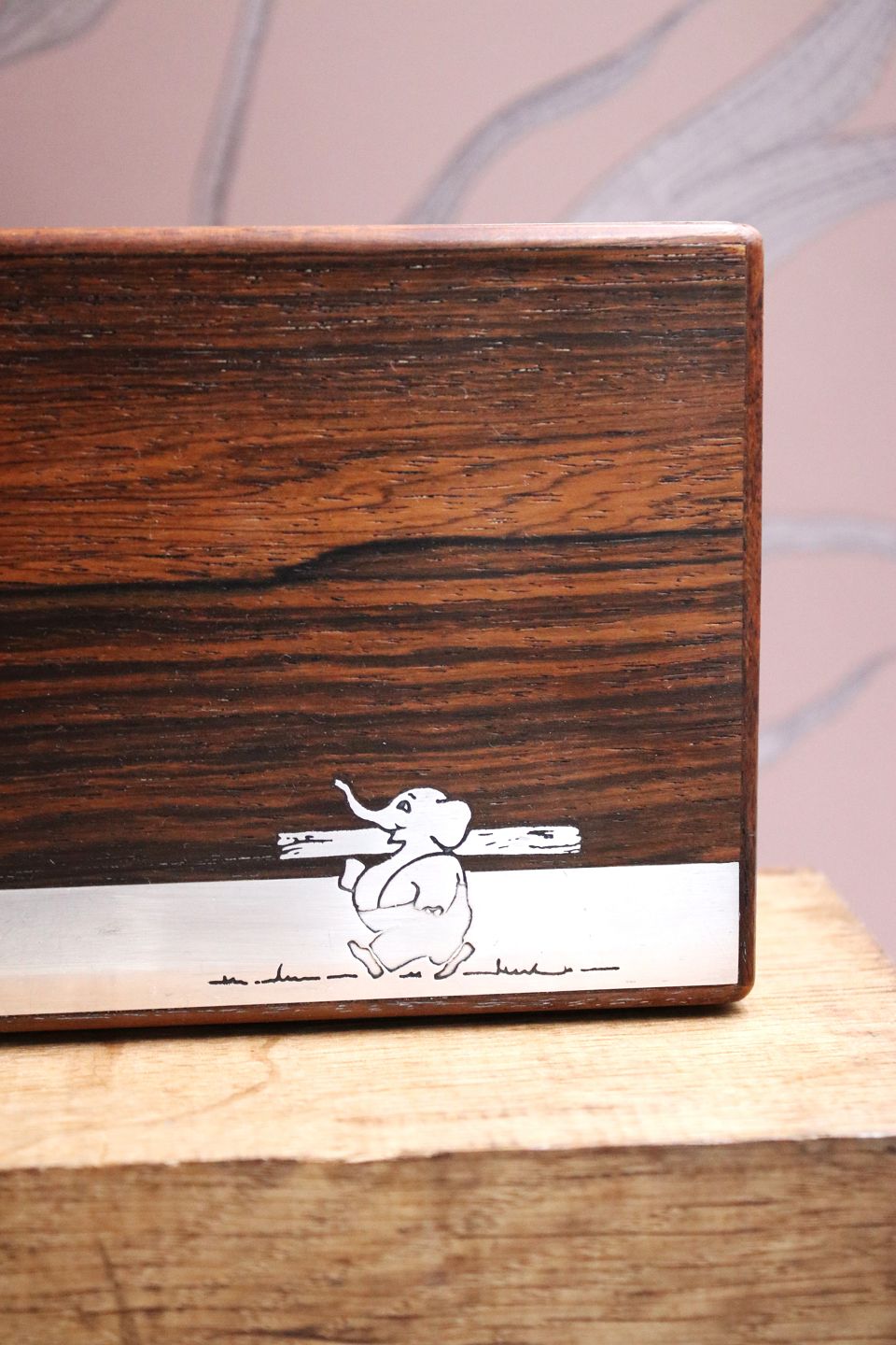 Oblong box in rosewood decorated with silver inlay with a motif of a small elephant carrying a tree trunk on its back.
