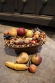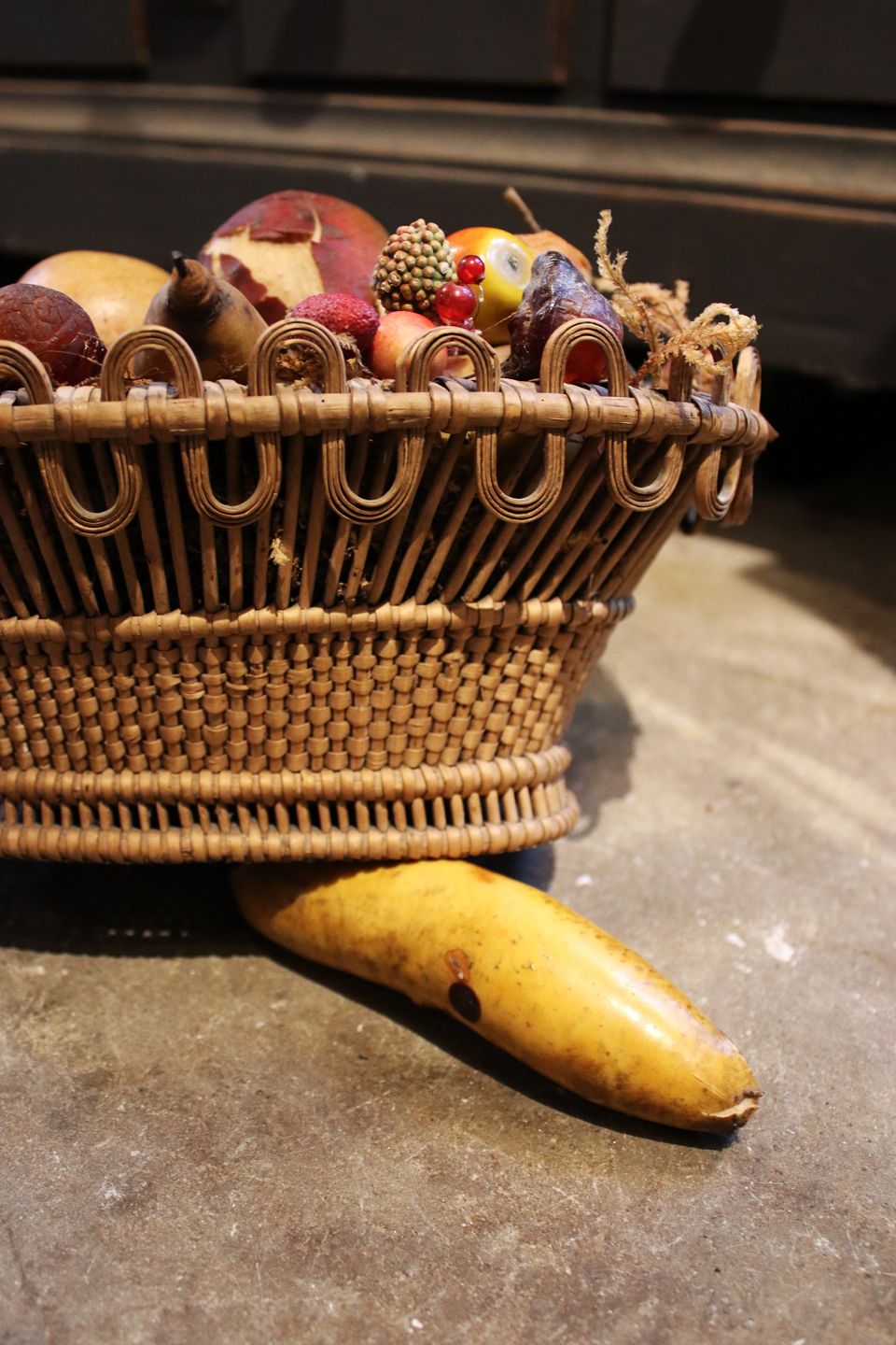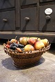 Dekorativ fransk frugtkurv fra 1800 tallet bestående af fin flettet trækurv fyldt med frugter i vat og bemalet voks (æbler , bananer , pære , druer m.m.) Frugtkurven har en rigtig fin gammel patina og der er lidt revner i nogle af frugterne. H: 16cm. / 27x21cm.