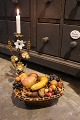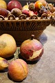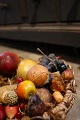 Dekorativ fransk frugtkurv fra 1800 tallet bestående af flettet kurv fyldt med frugter i vat og bemalet voks...