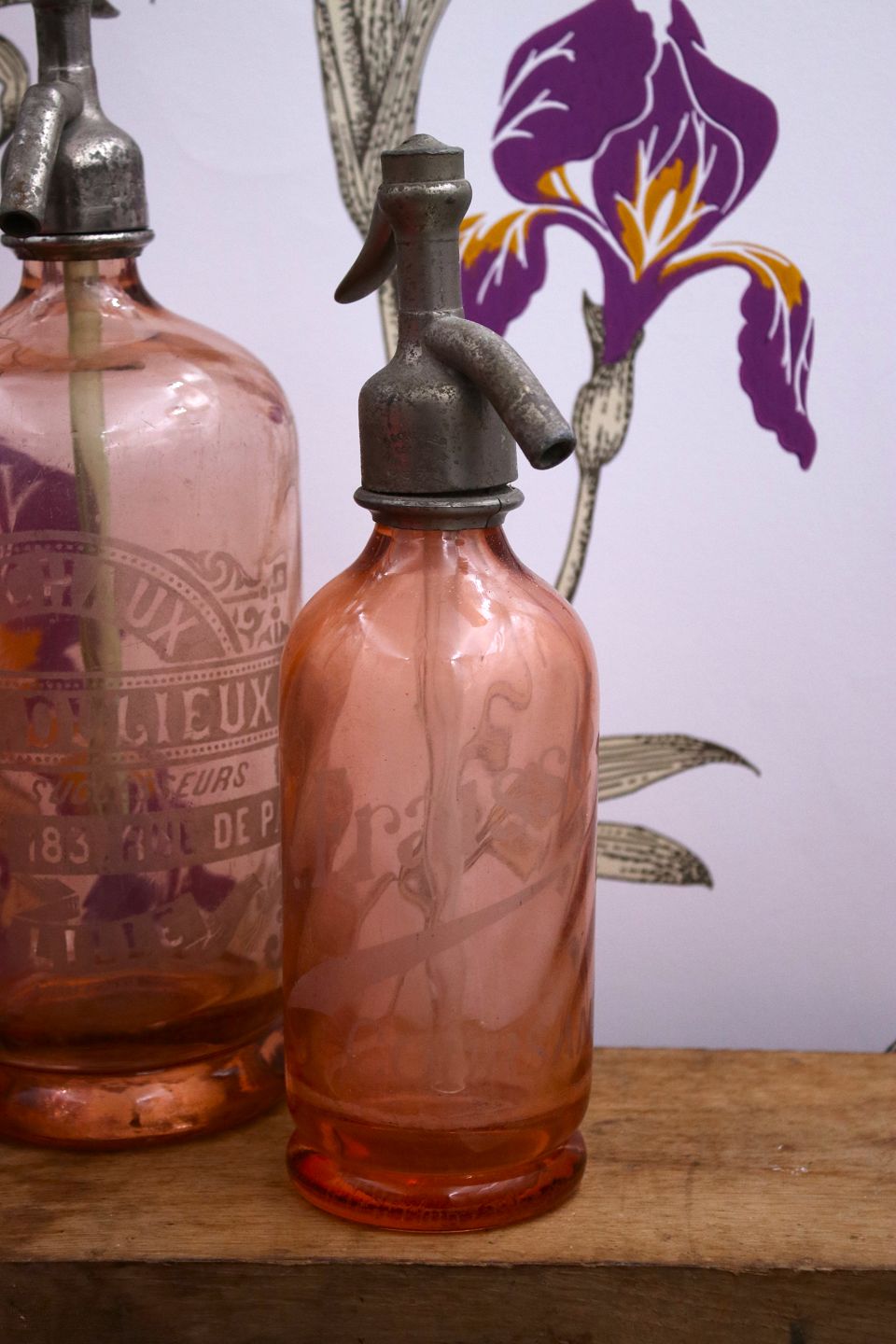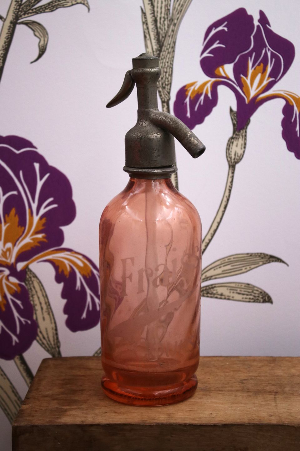 Dekorativ , sjælden fransk mini glas sifon fra begyndelsen af 1900 tallet i rosa farvet glas med graveret skrift på siden af sifonen og en fin patina.
