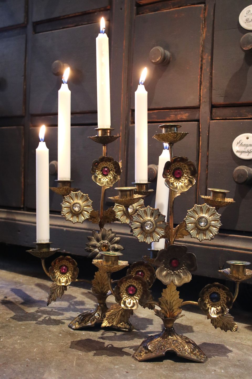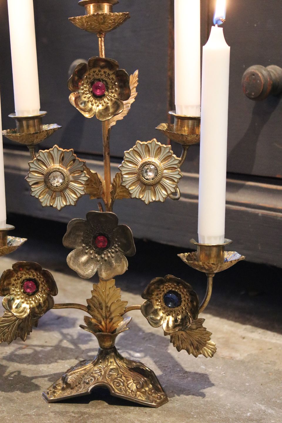 Antique, French church candlestick in gilded metal decorated with 6 metal flowers with colored stones...