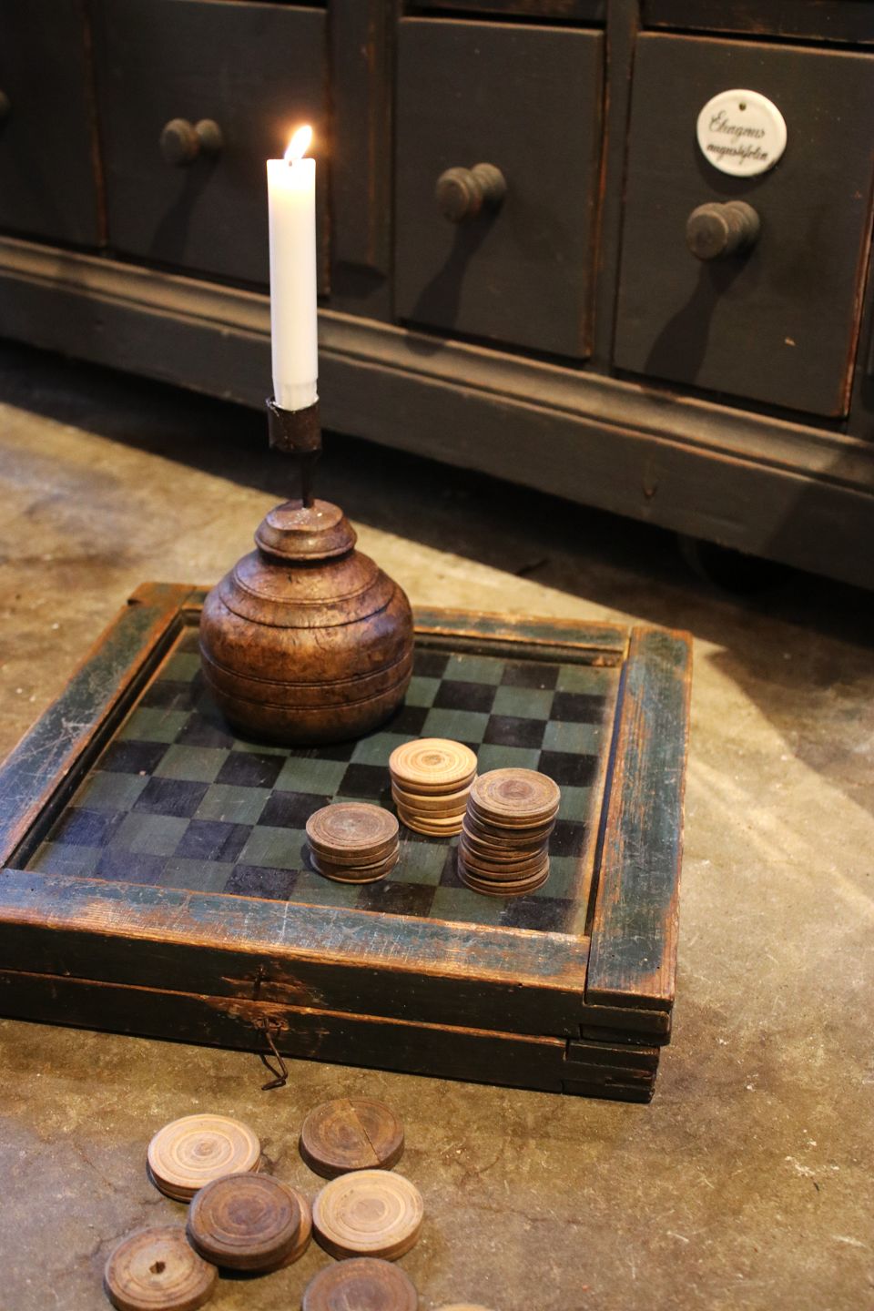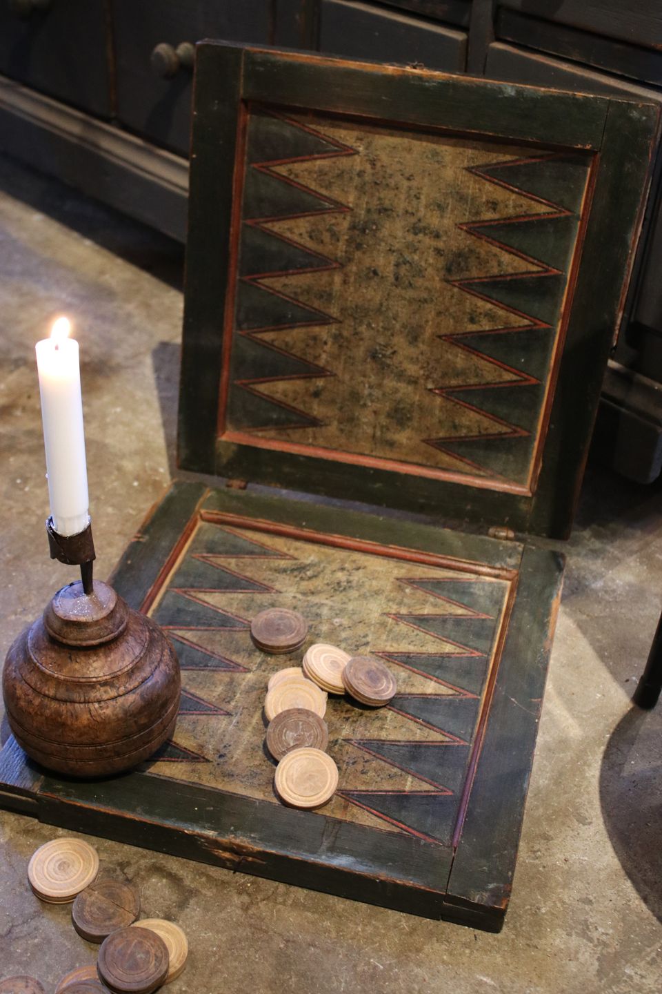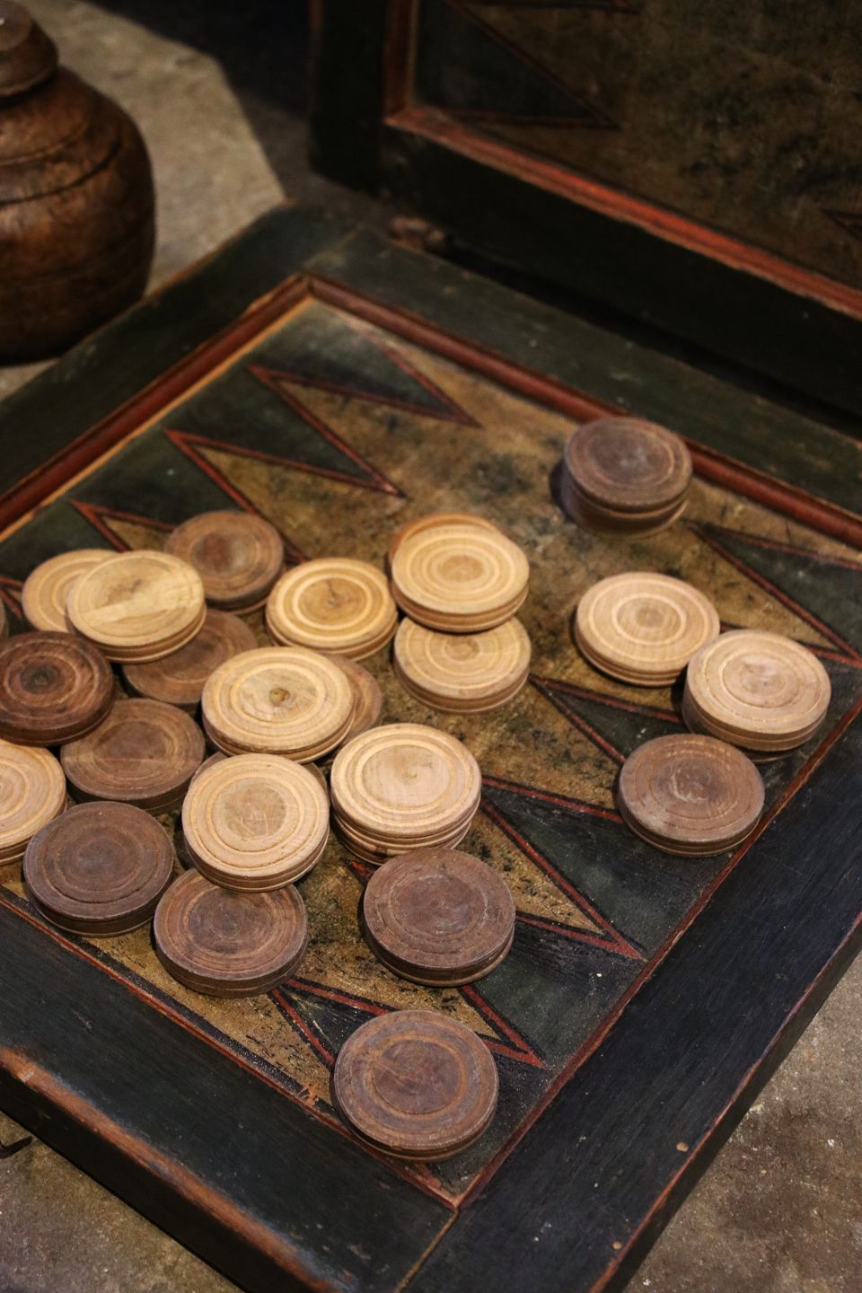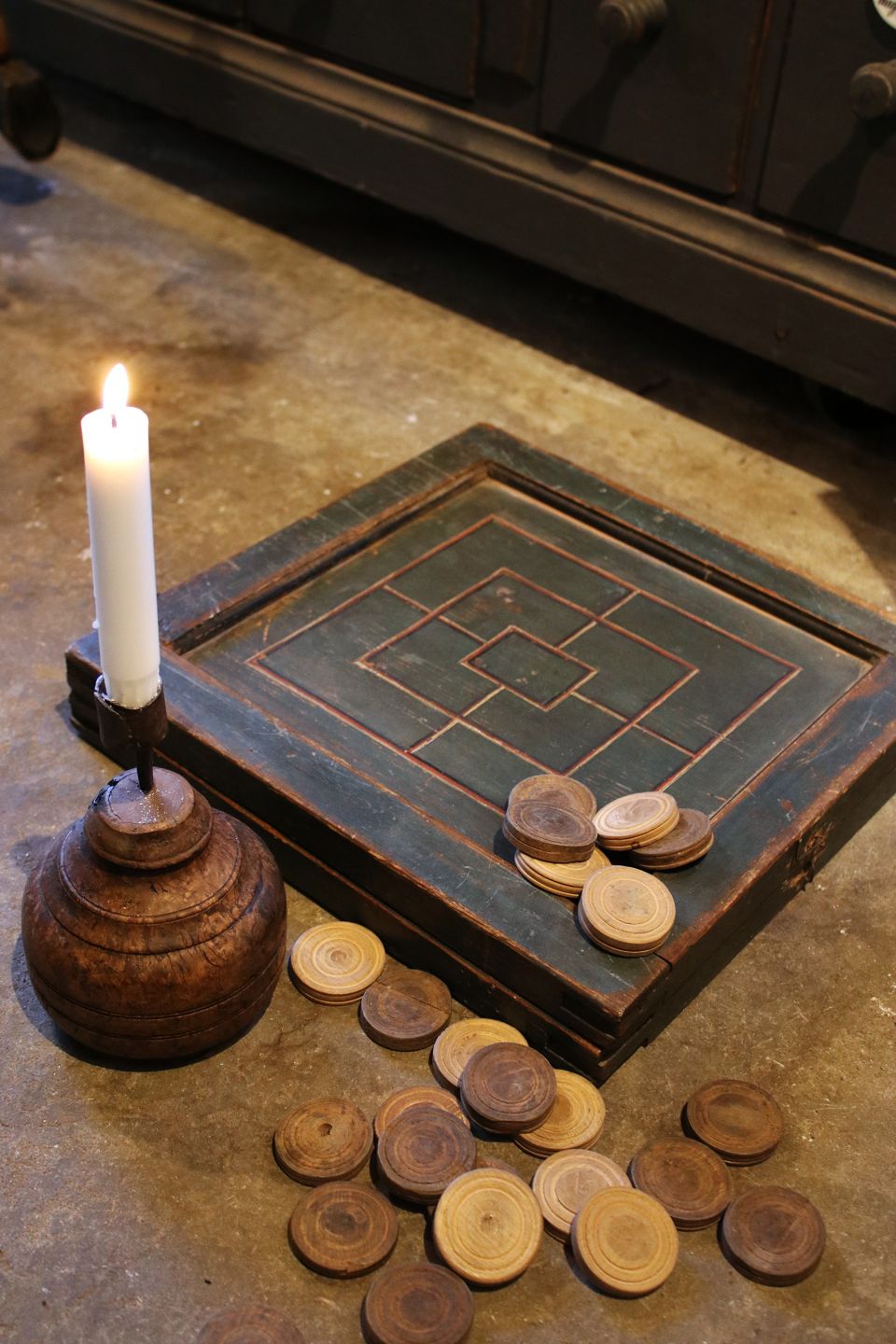 Charming antique 19th century game box / board game in painted wood with 3 different games. Has a super nice patina.
