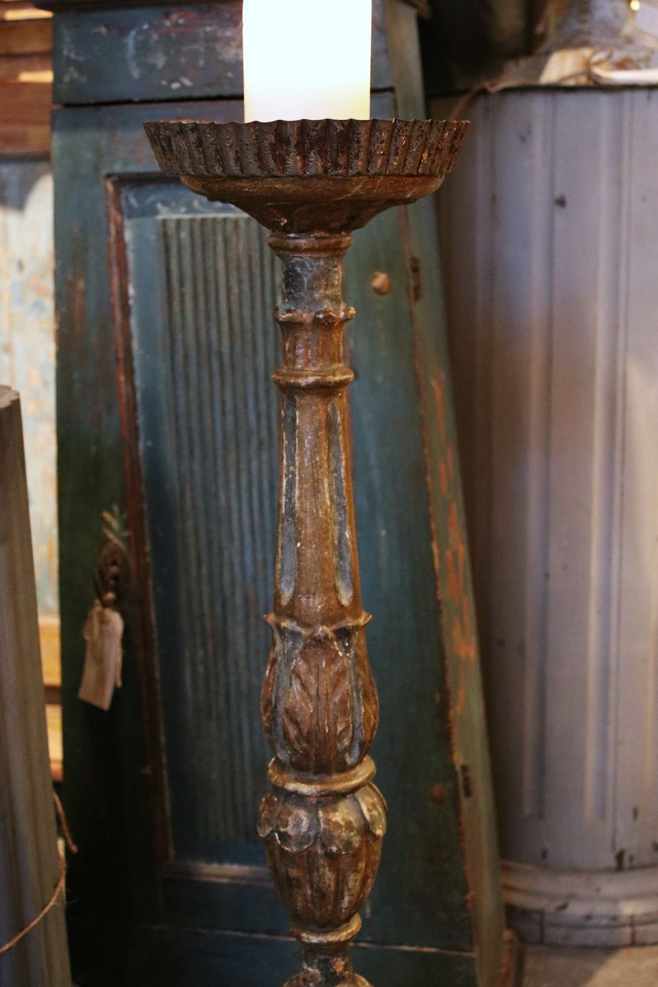 Antique, French 19th century floor candlestick in carved wood with original paint and a really nice patina. Height: 80cm.