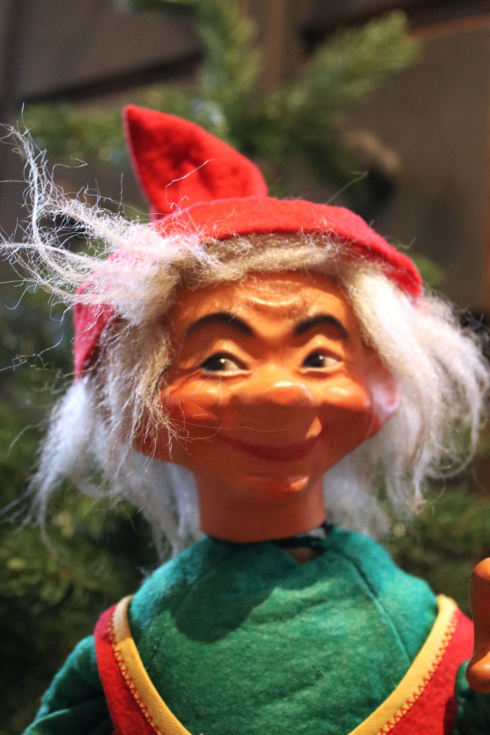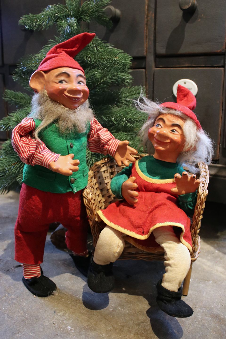 2 old shop elves with felt clothes and faces in painted papier-mâché. (Mother and Father)...