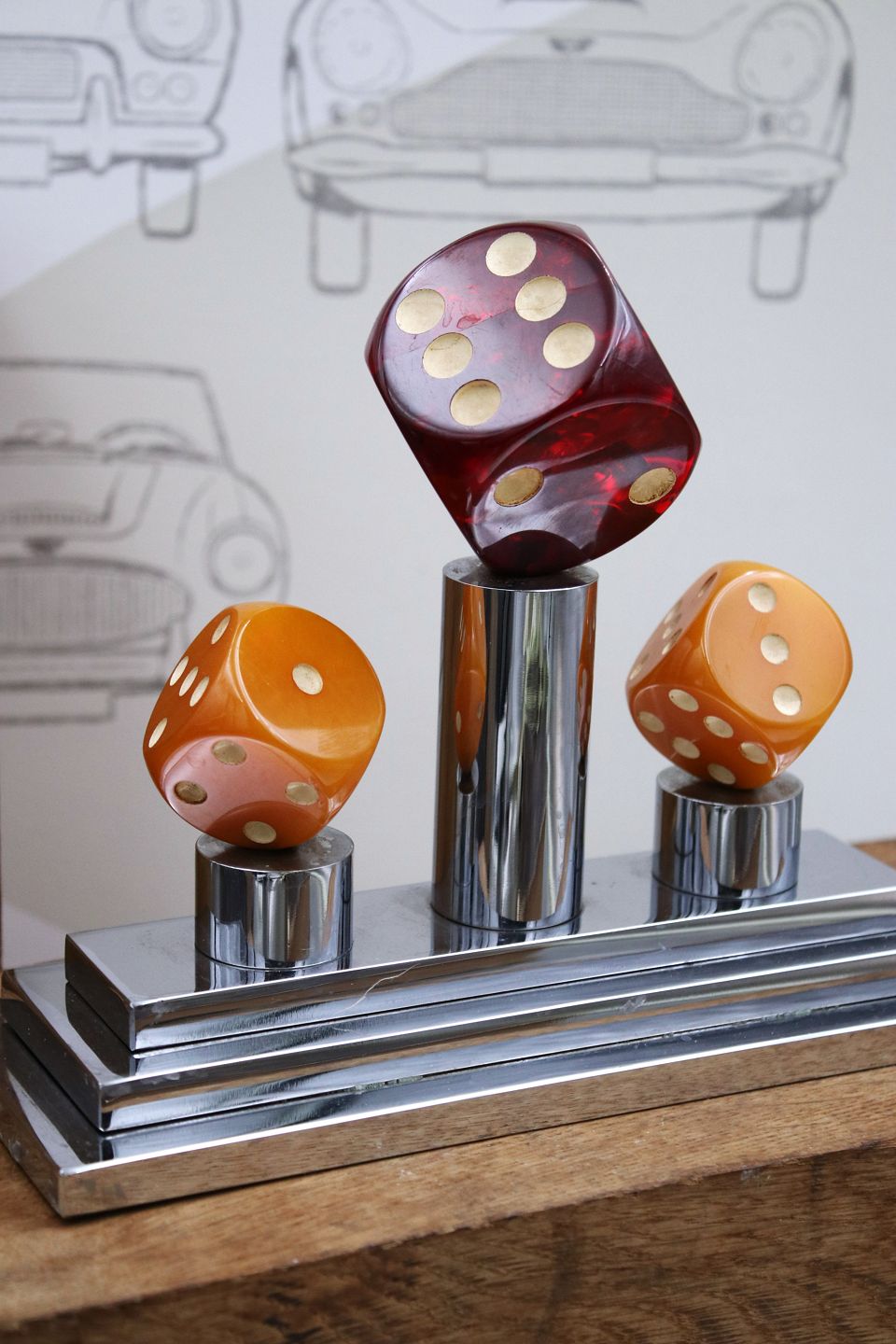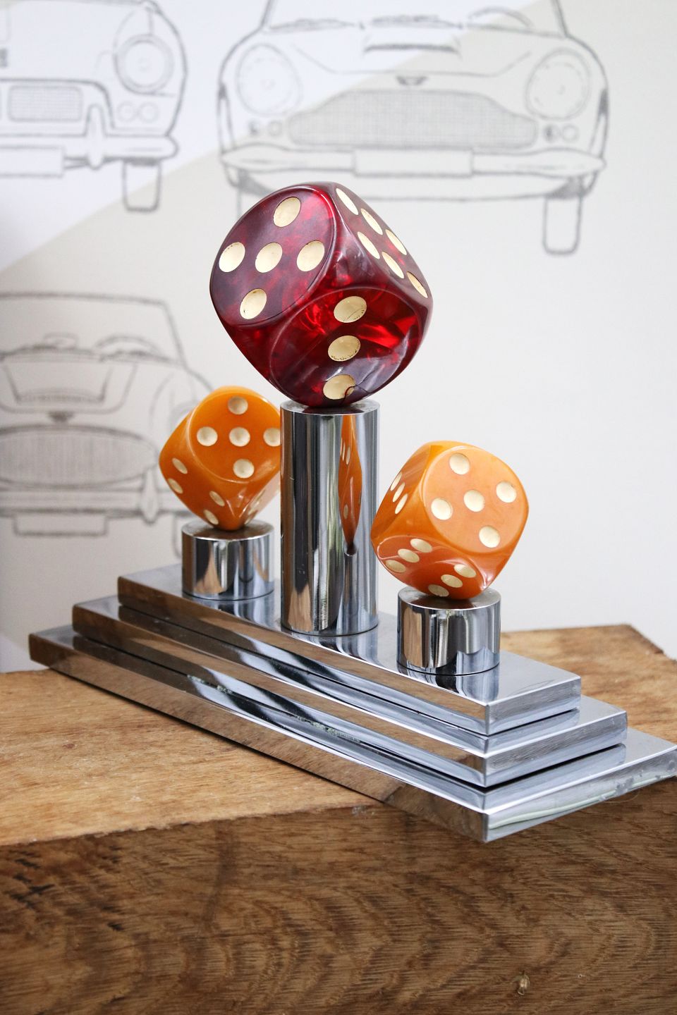 Dekorativ , gammel spille pokal i krom med 3 store terninger i farvet akryl. H: 17cm. L&B: 21x8cm. (Vejer 3,5 kg.) Emne nummer: Spille pokal