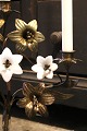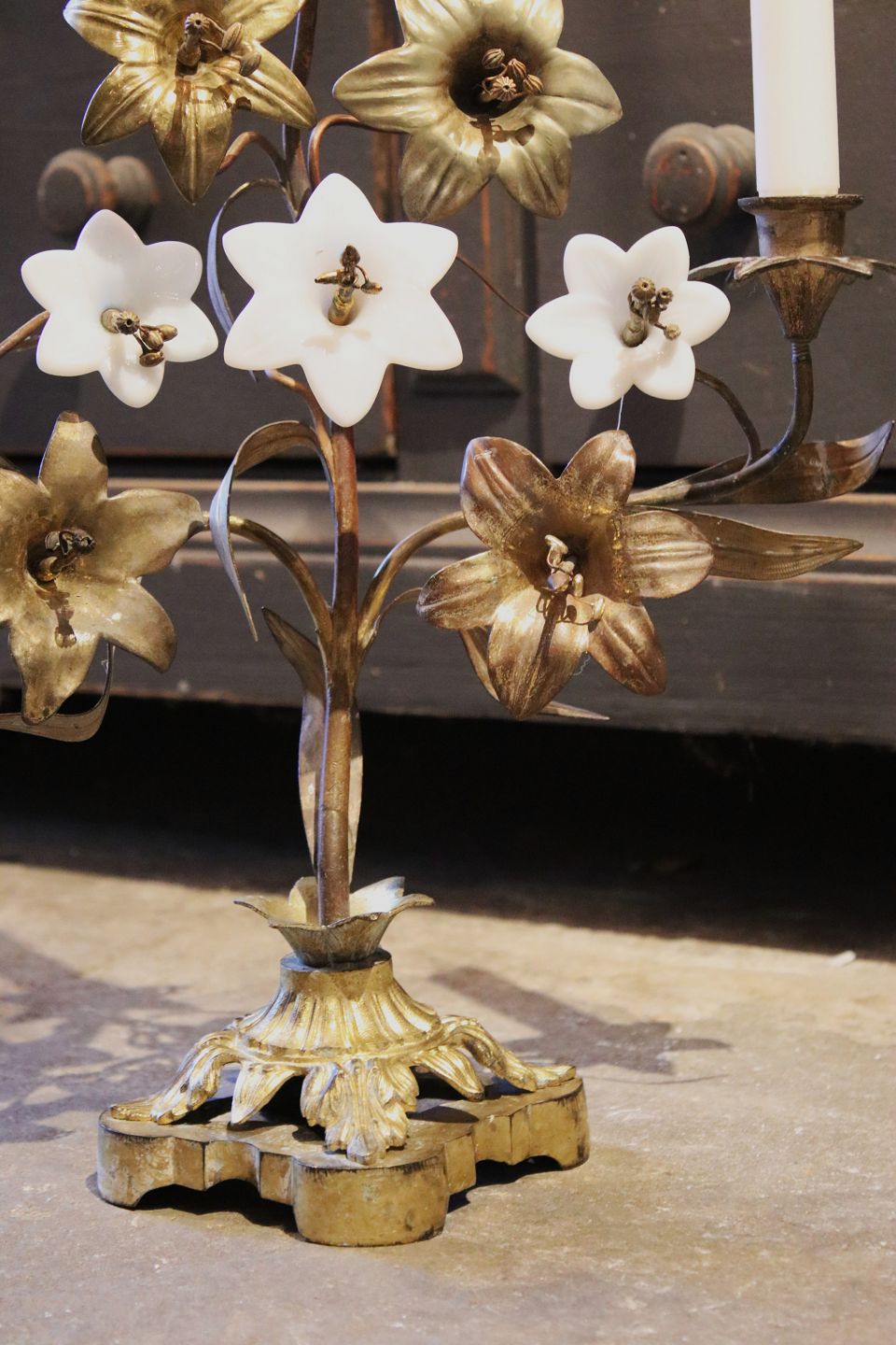 Gammel fransk kirkelysestage i bronze , dekoreret med bronze liljer og 3 gamle hvide opaline glas liljer.