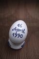 Royal Copenhagen porcelæns æg med Dronning Magrethe II monogram og inskription 16. april 1990 , lavet i forbindelse med Dronningens 50 års fødselsdag. H: 6cm. Dia.: 4,5cm.