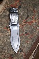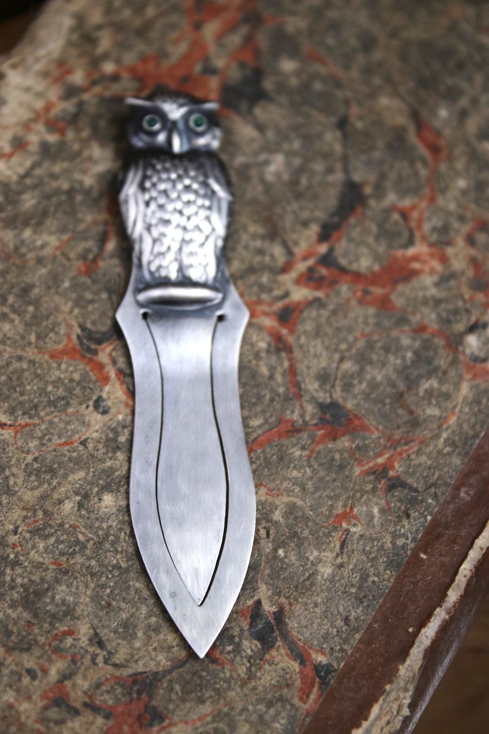 Gammelt bogmærke i sølv i form af en lille ugle med grønne glas øjne. Stemplet 830s. Længde: 8,6cm. Emne nummer: Bogmærke sølv nr.2