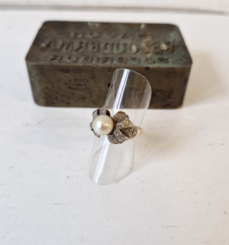 Vintage ring in 14 kt red and white gold with beautiful akoya pearl. The ring is not hallmarked. It is tested for 18 kt. Ring size 49