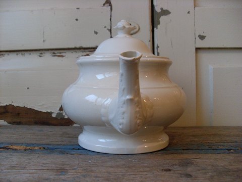 Smuk gammel fajance tekande. Fremstår med et lille skår på tuden samt afslag på lågknoppen, se billederne. Højde 18cm. Længde 29cm.