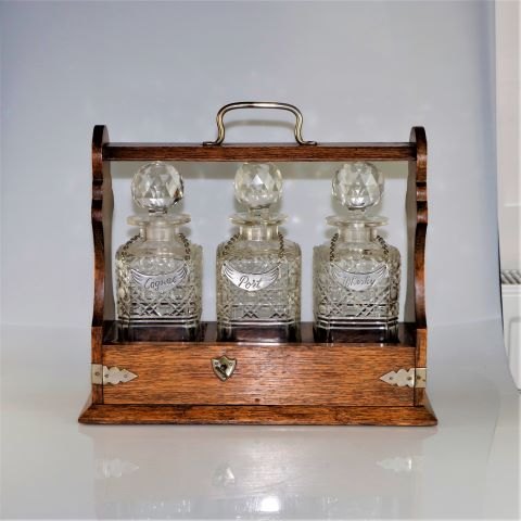 Flot håndlavet trækasse af teaktræ med 3 kvadratiske krystal flasker, som hver bærer et tinskilt. Skiltene er mærket med Cognac, Port og Whisky, fremstillet i Holland.