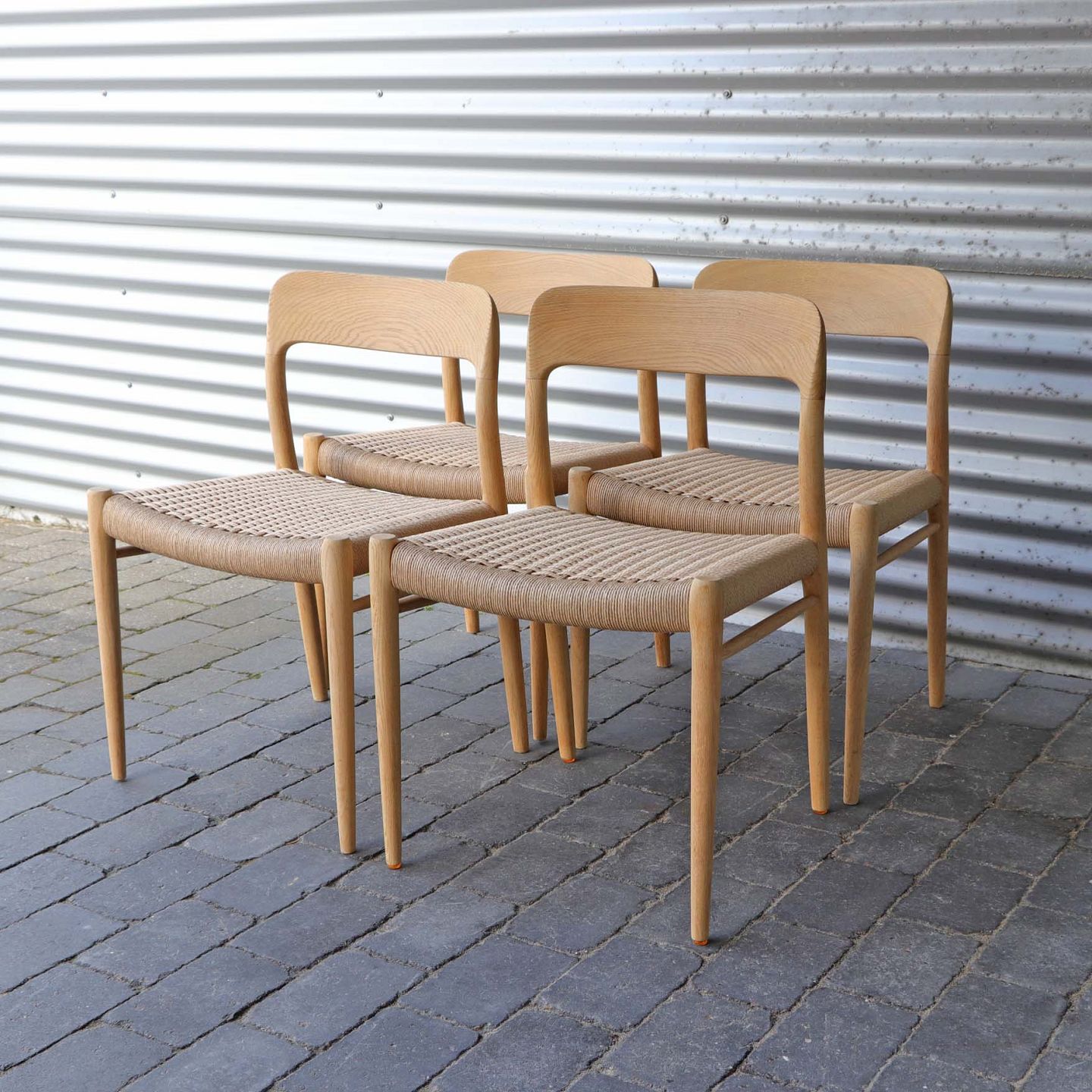 Et styk spisebordsstole model 75 i sæbehandlet eg med nye sæder i papirgarnsflet