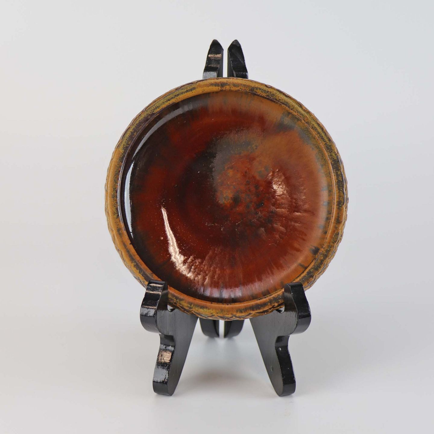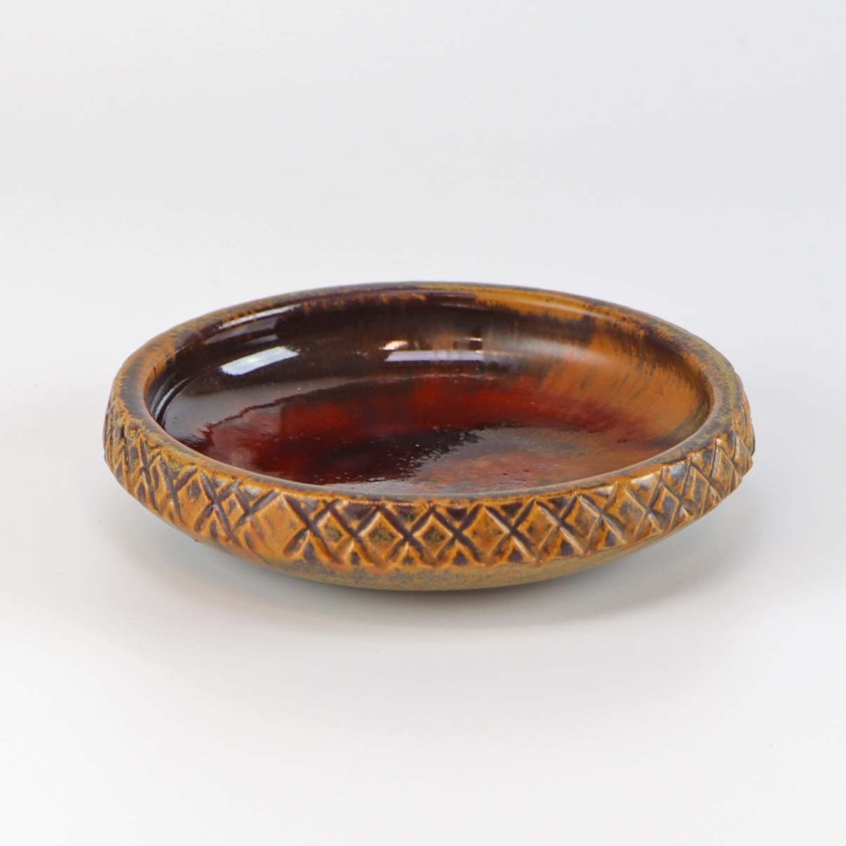 Skål eller fad af stentøj med rødbrune farver og orange brune nuancer