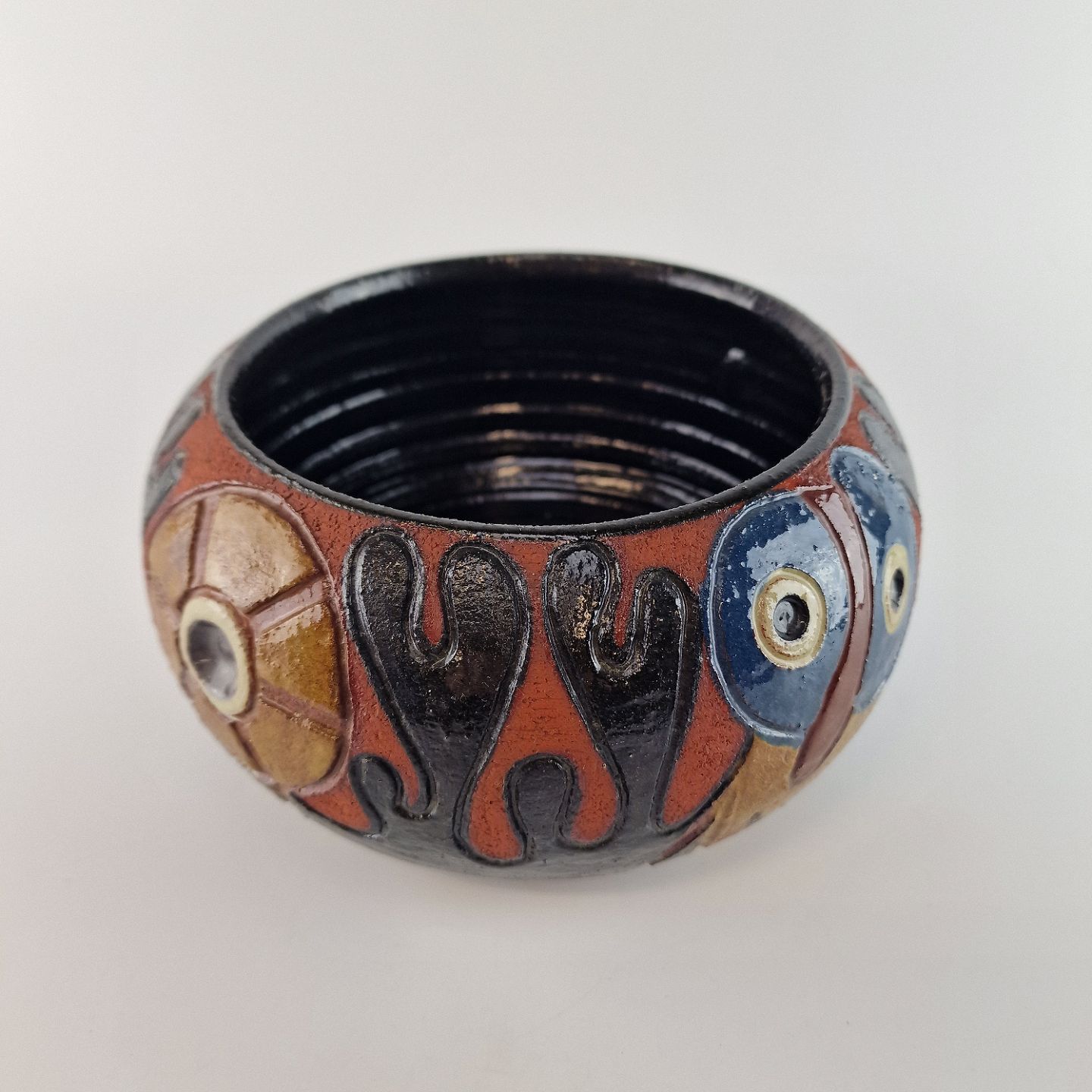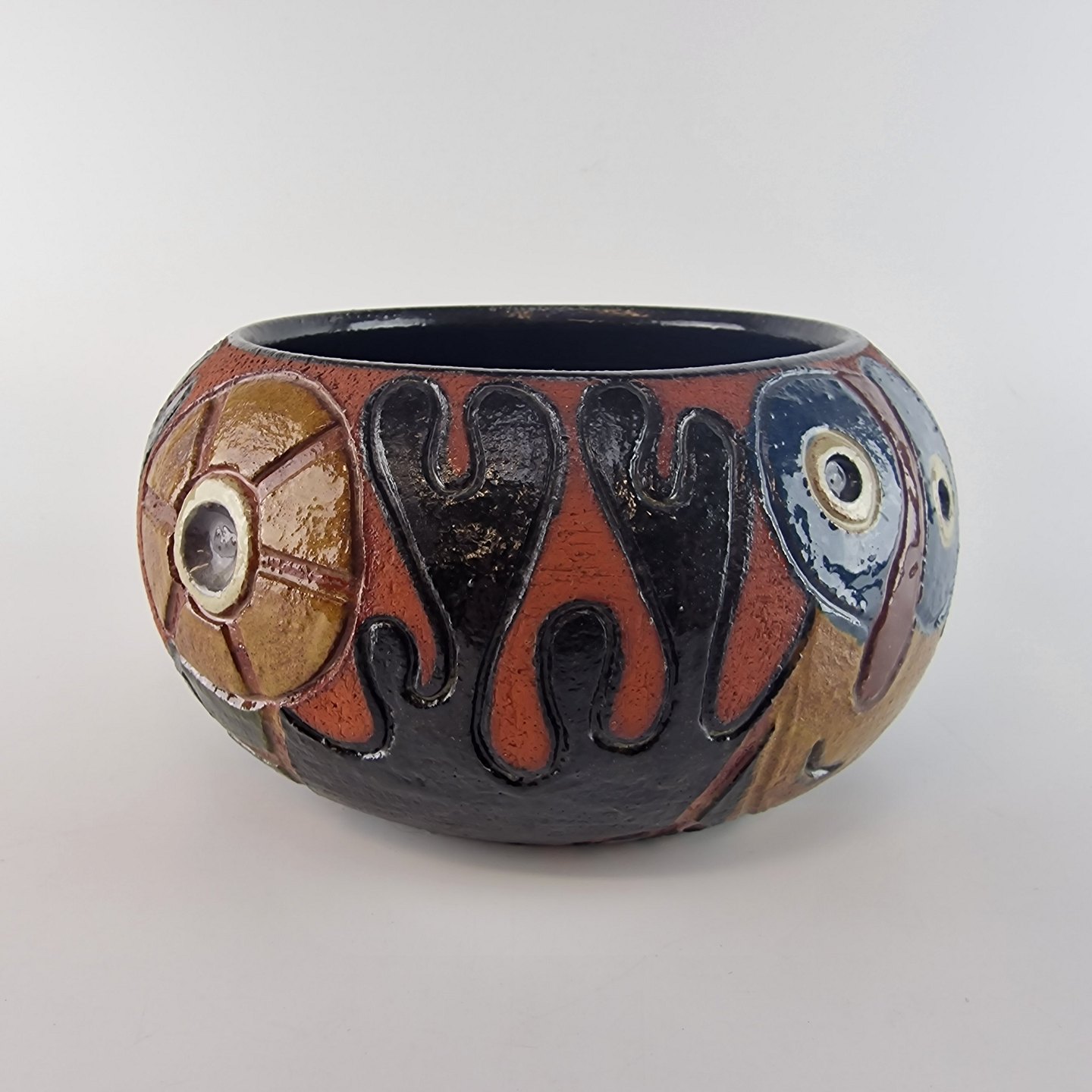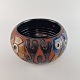 Skål af stentøj, dekoreret med forskellige former og farver. Glaseret sort indvendigt