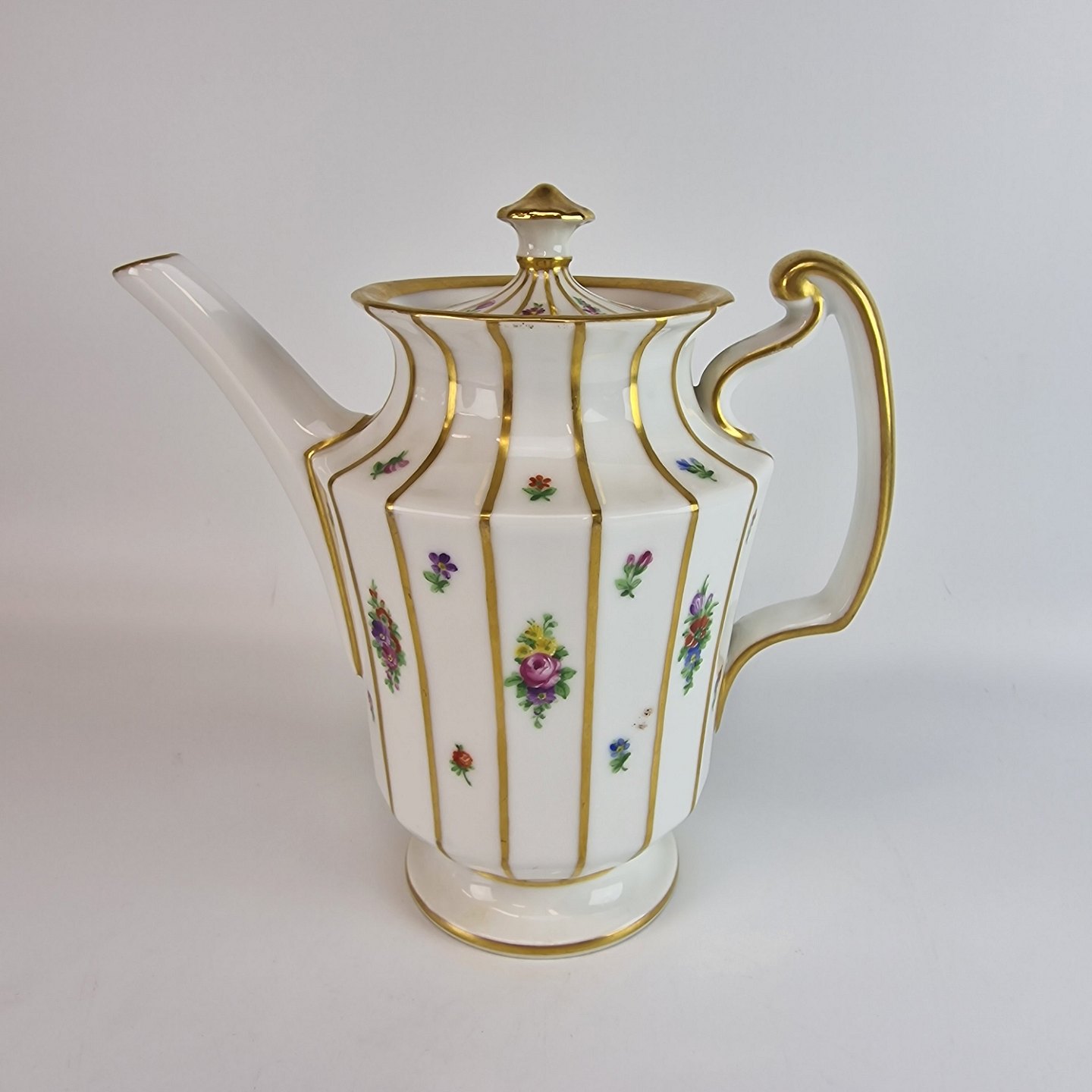 Henriette er af porcelæn og har motiver af små blomsterbuketter og guldstreger på det kantede stel.
