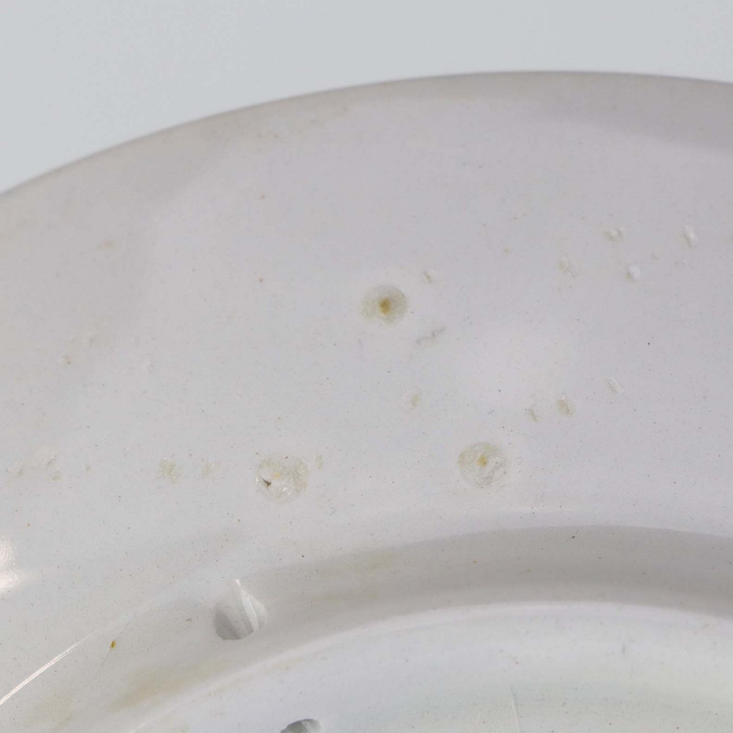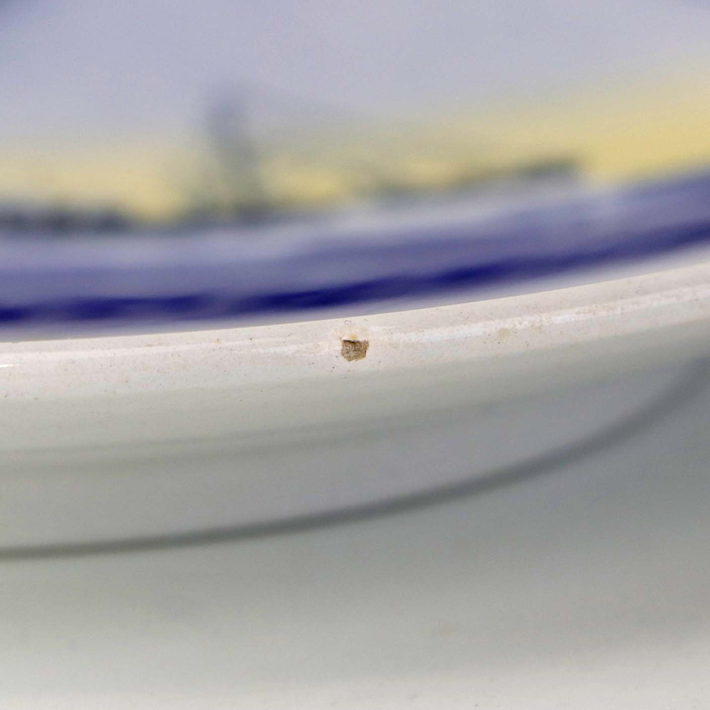Fremstår med et mindre nøk i kanten, sporadisk blå farve kantfarve samt ujævnheder i fajancen på bagsiden.