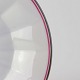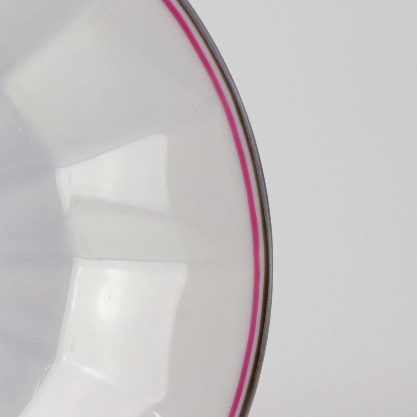 Service i kantet hvidt porcelæn dekoreret med lyserød og grå stribe ved kant.