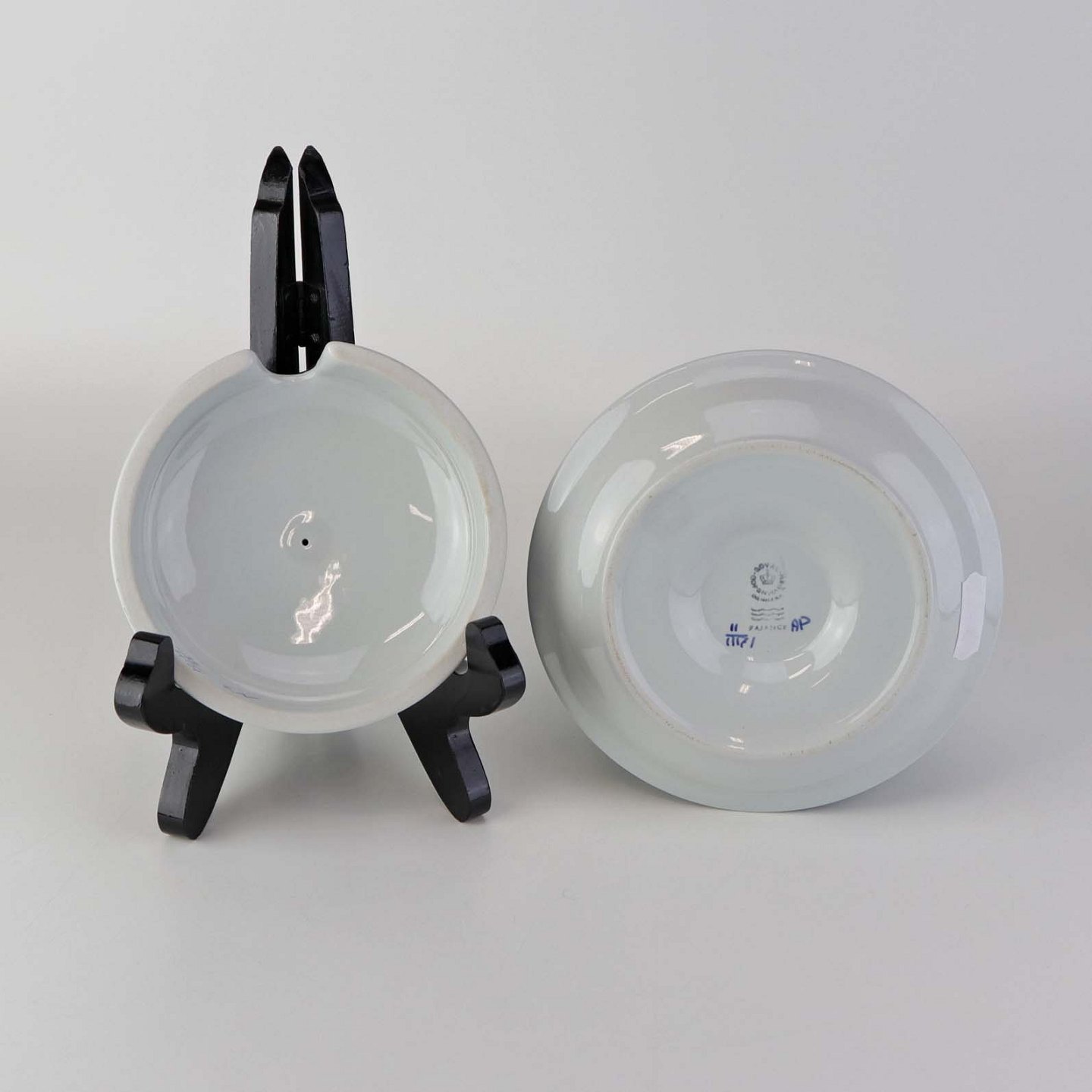 Glat Lyst fajance med blå dekoration af blomster og blå bort.