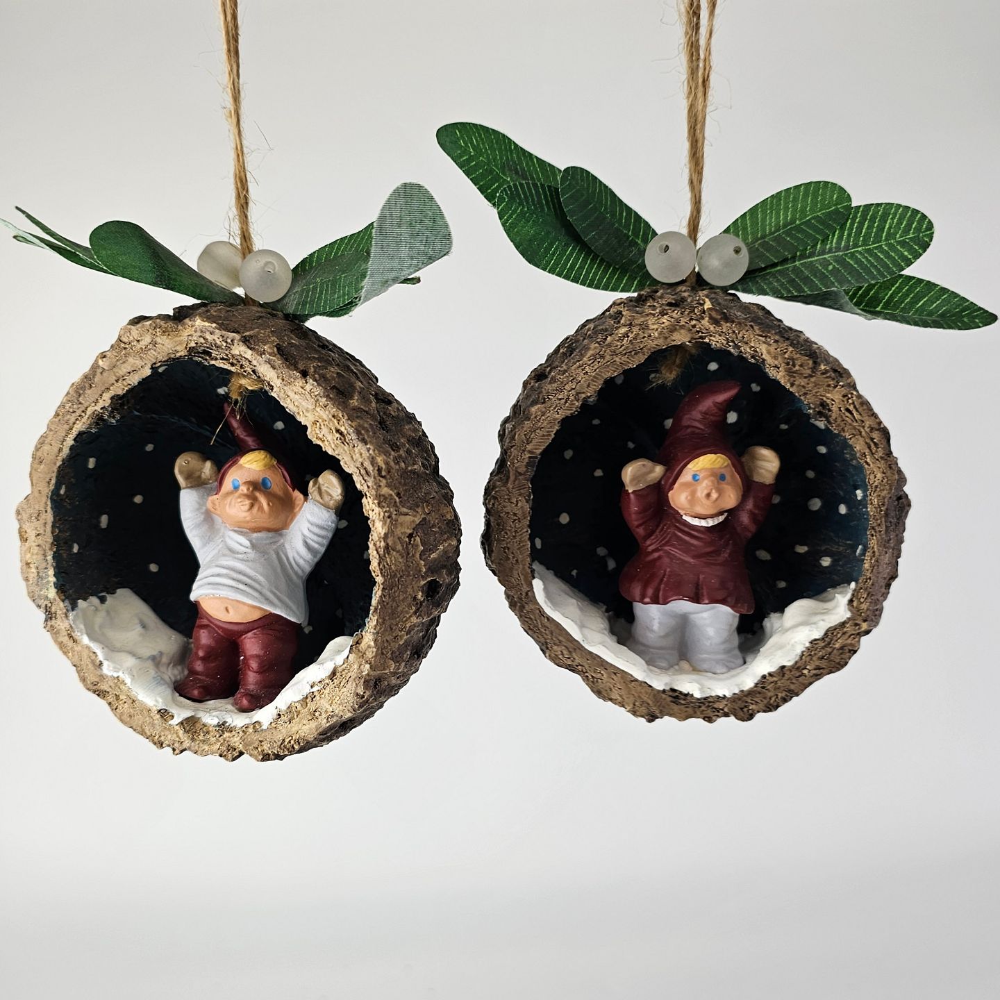 Figursæt til ophæng med motiv af nisserne Mai og Max i kokosnødder