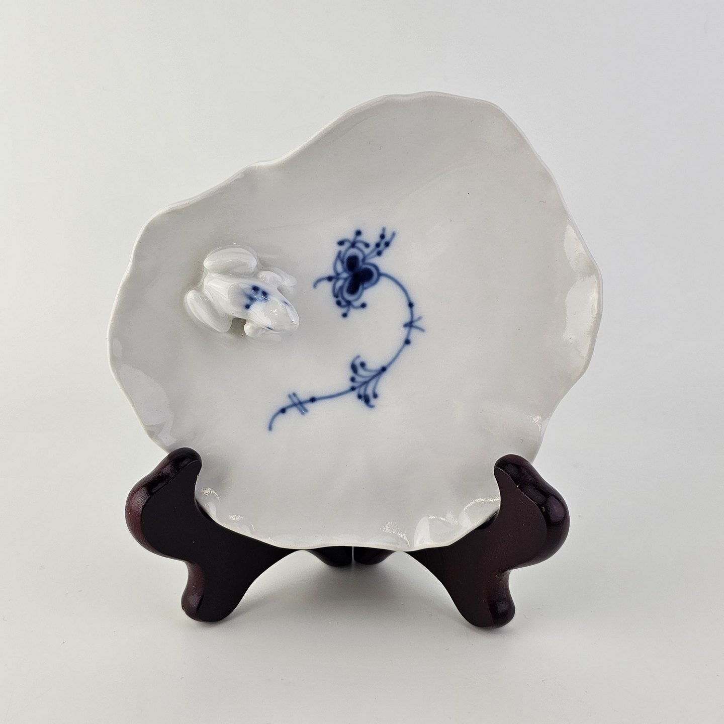 Skål i hvidt kongeligt porcelæn med motiv af en frø på en åkande og musselmalet dekoration