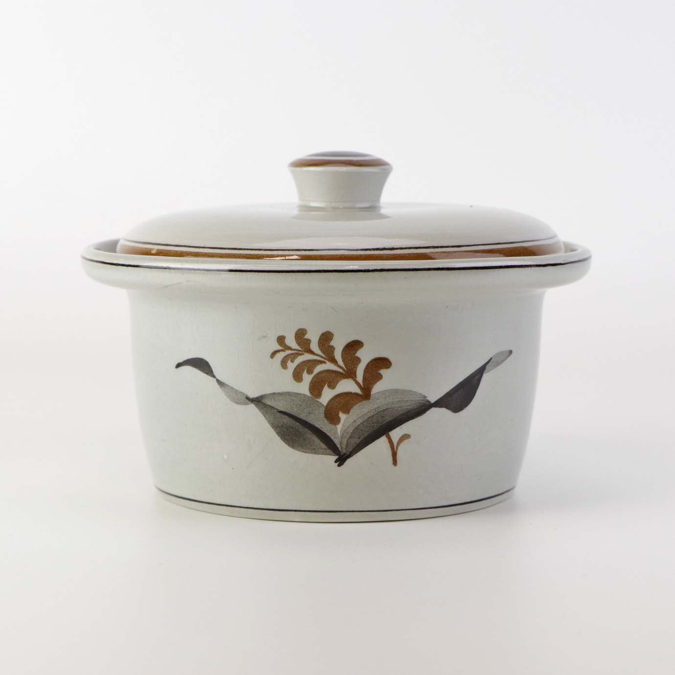 Smørskål med låg i fajance fra stellet Kirsten, som blev fremstillet i perioden 1934-1957. Nr. 1749
