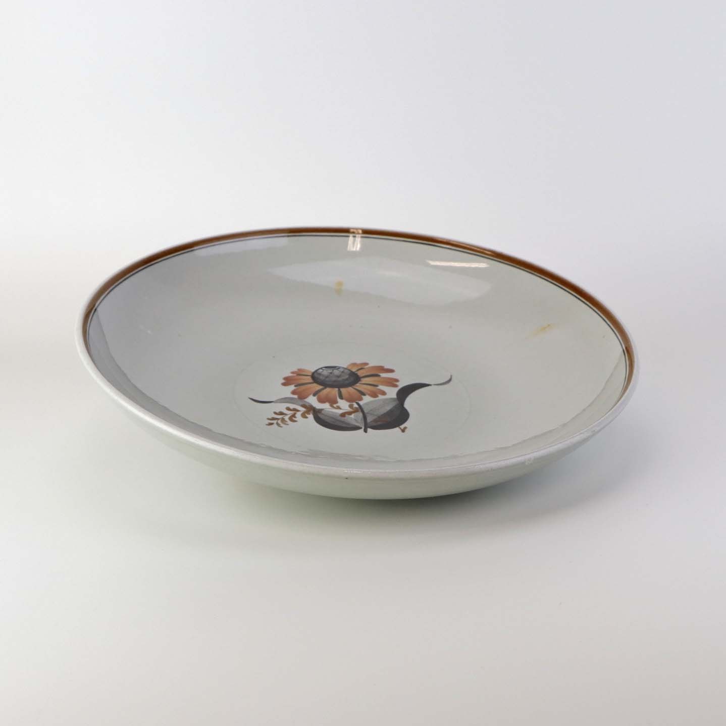 Fajancestellet er i stelformen Viktoria II med dekoration af orangebrune blomster på gråtonet baggrund med brun kant.