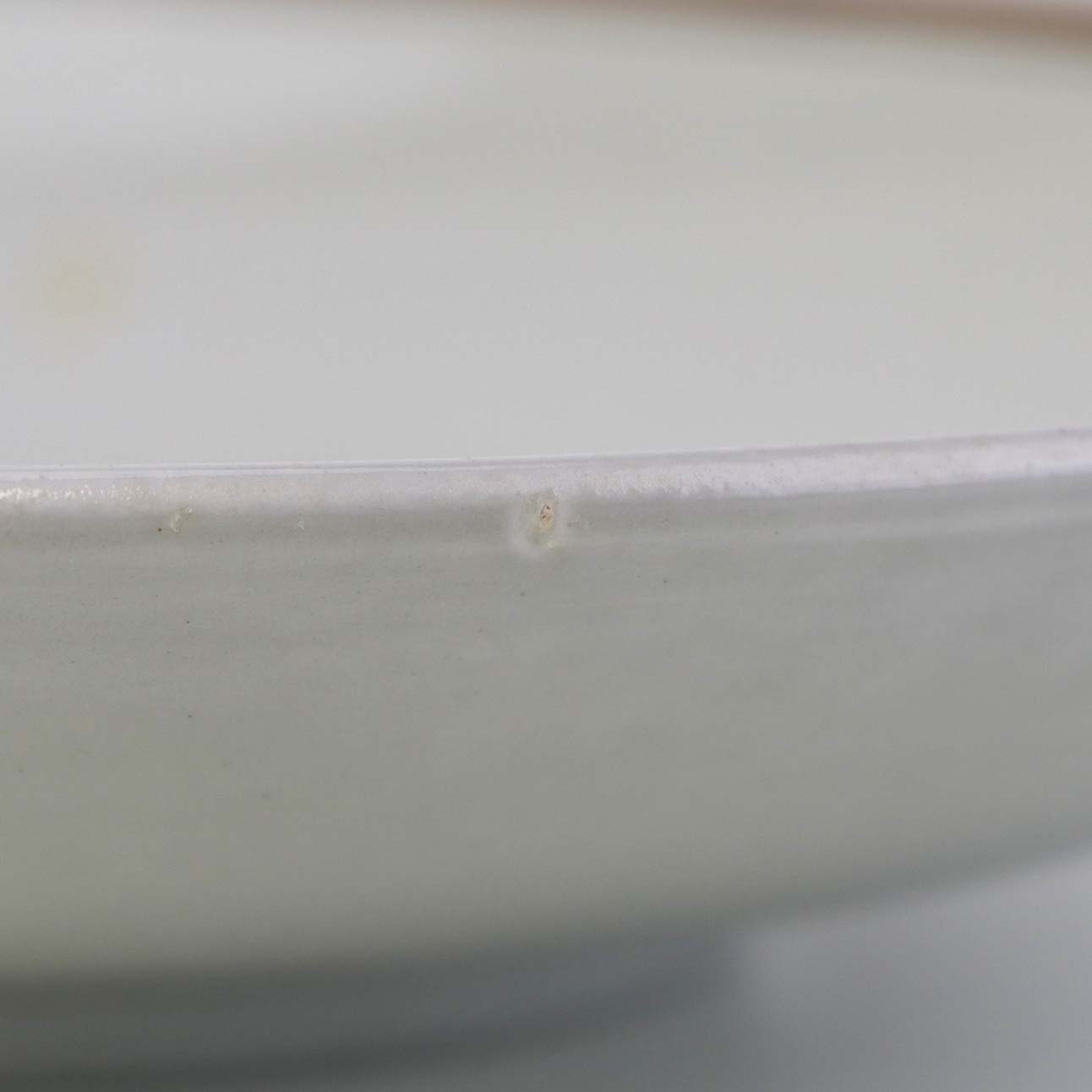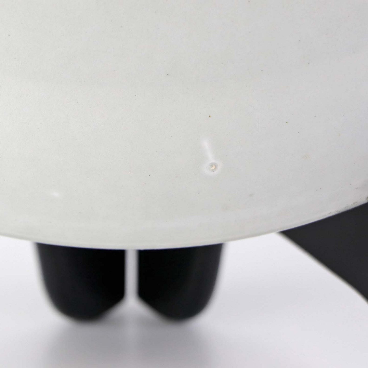 Fremstår med tre mindre misfavninger under glasuren, sorte nister og ujævnhed i glasuren.