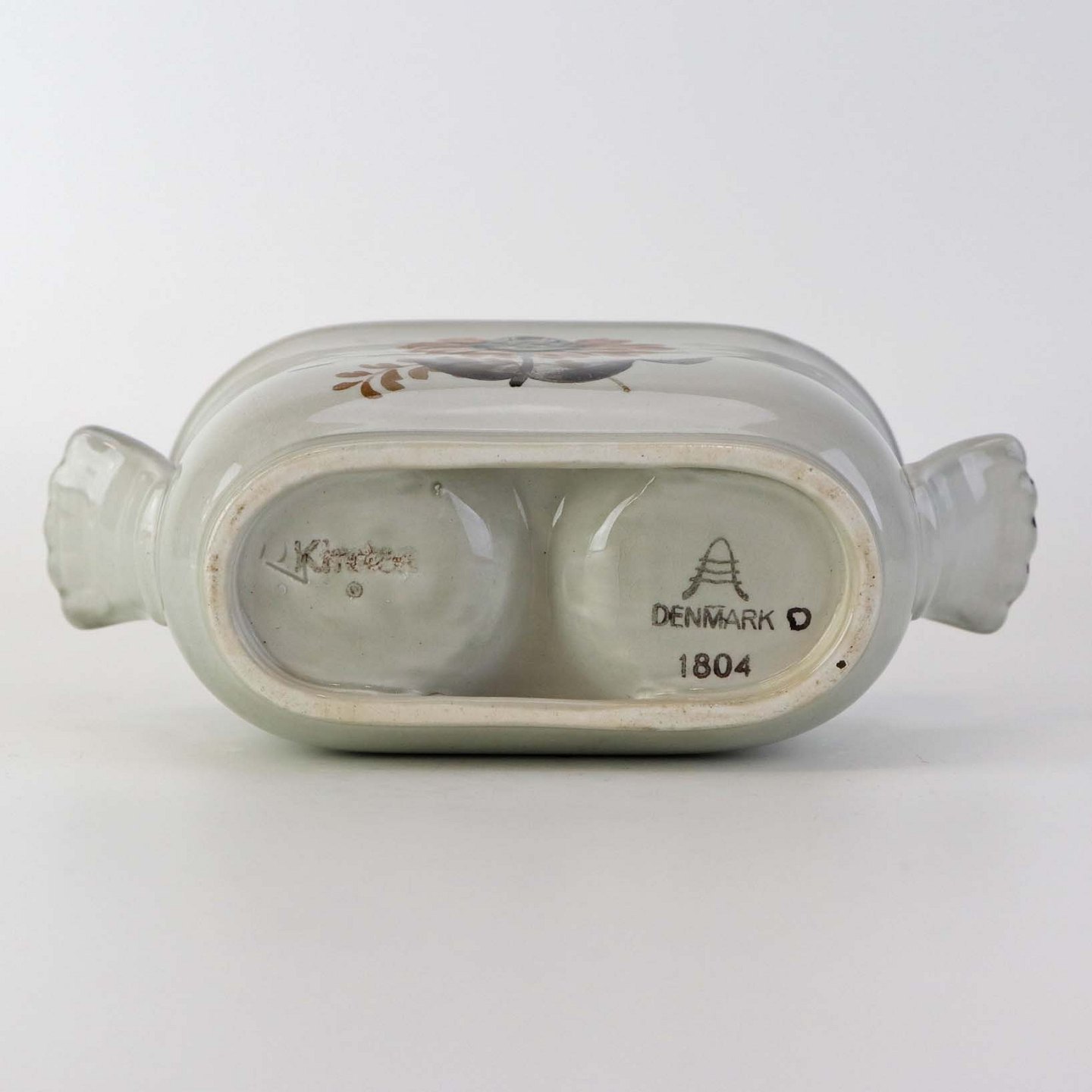 Sæt med to glasflasker til olie og eddike med prop i kar med hanke af fajance fra stellet Kirsten, som blev fremstillet i perioden 1934-1957.