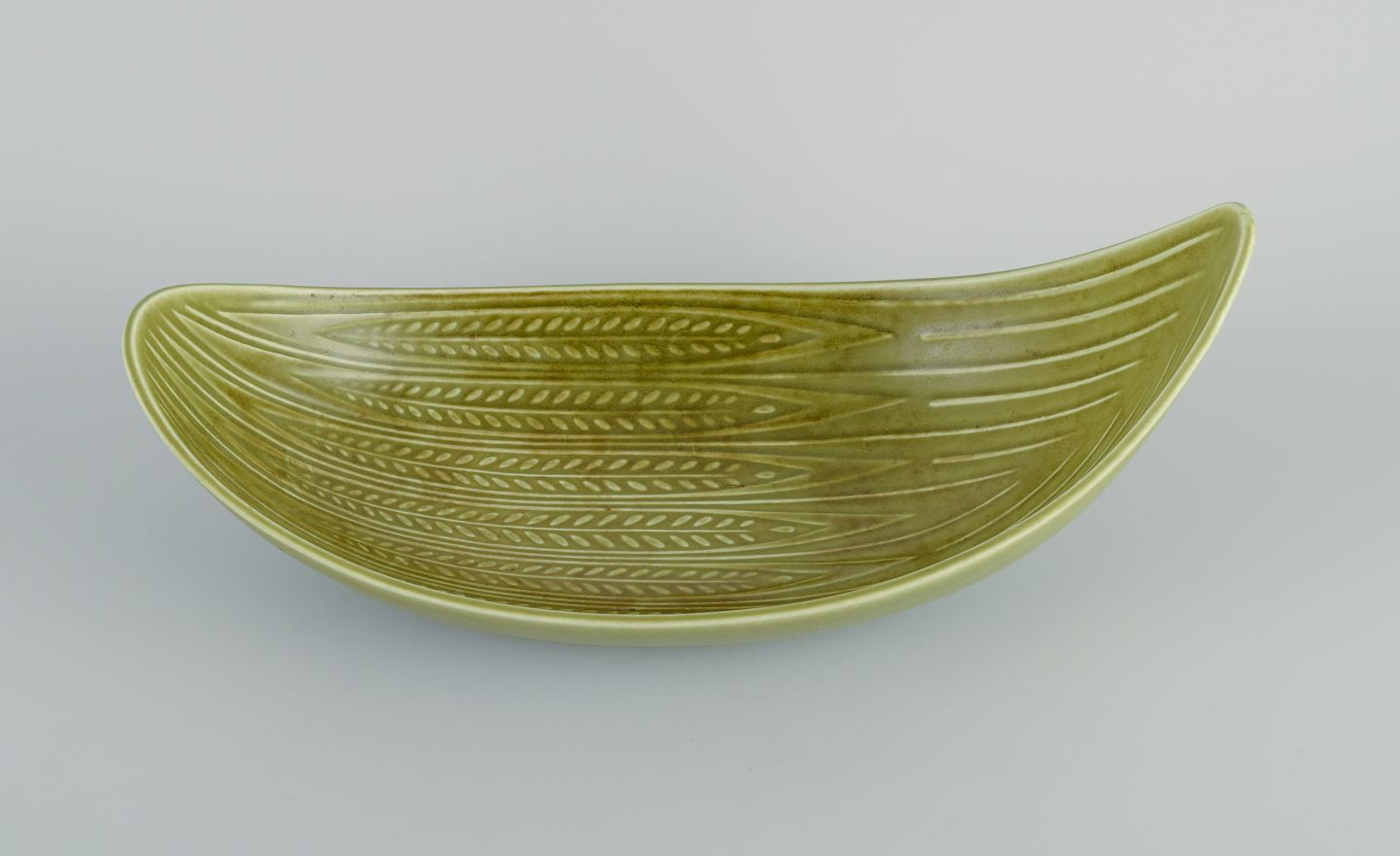 Gunnar Nylund (1904–1997) for Rörstrand. Rialto bowl in ceramic, oblong organic shape with light green glaze.