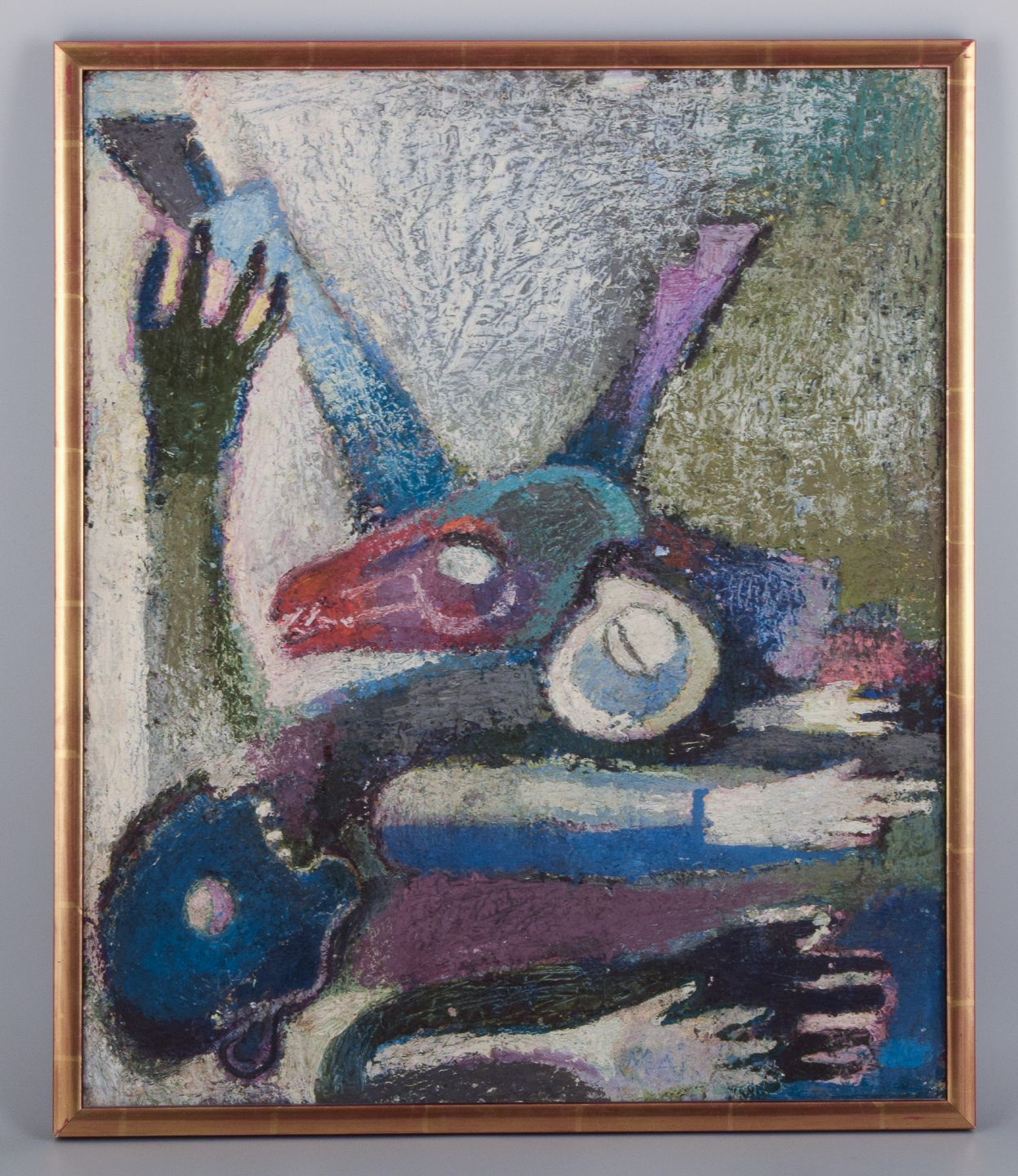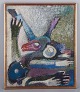 Maj Hemberg, Swedish artist, oil on board. Abstract composition. Colorful palette. Painted with thick brushstrokes.