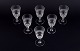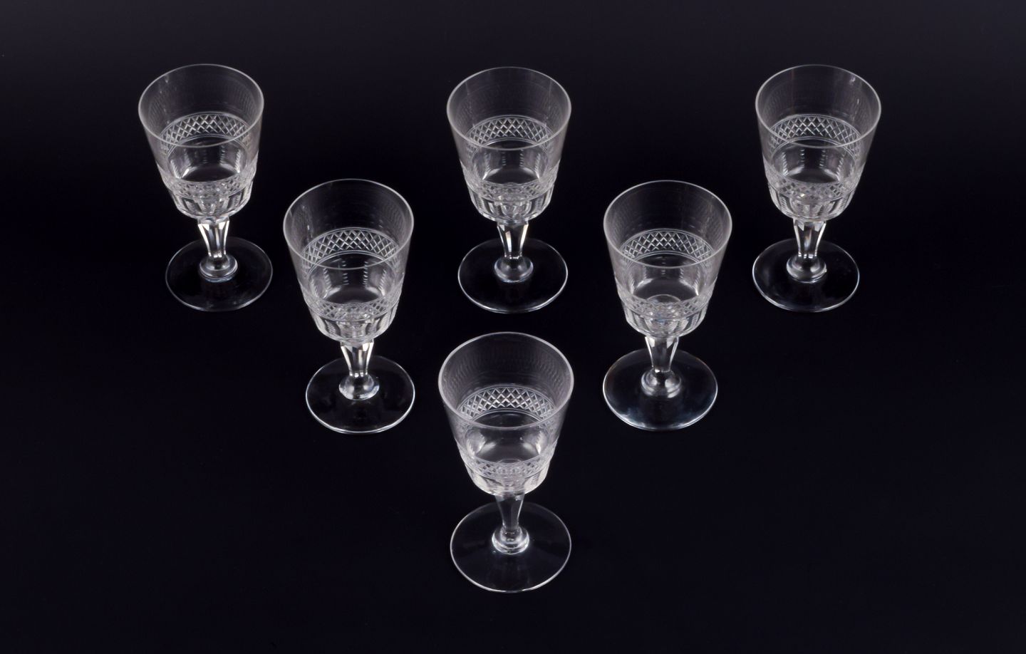 A set of six mouth-blown French white wine glasses in crystal glass. Faceted cut. Handmade. Circa 1900. Perfect condition. Dimensions: D 6.2 cm x H 12.0 cm.