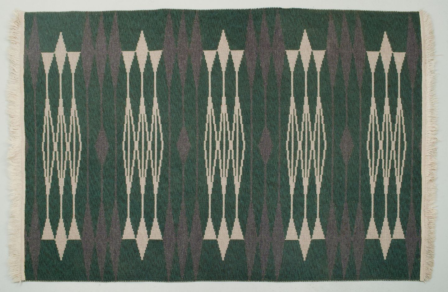 Swedish textile designer. Handwoven carpet in pure wool. Modernist design. Geometric fields in white and purple on a green background.